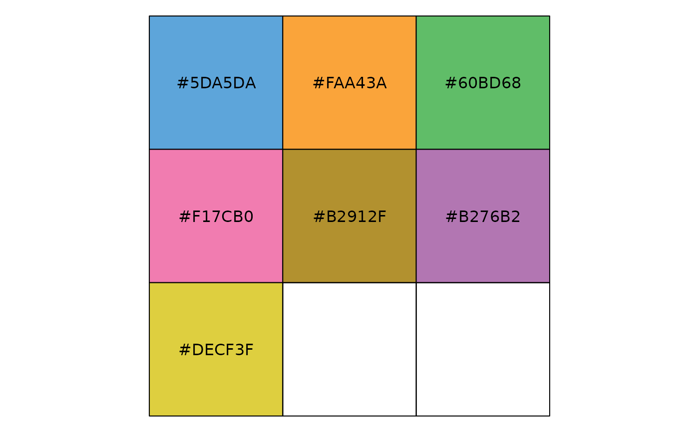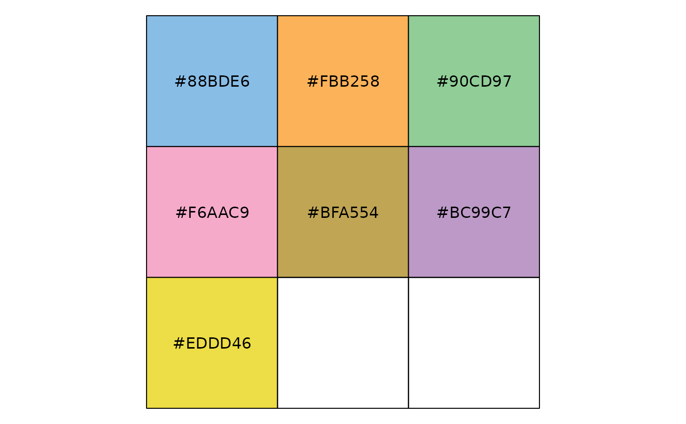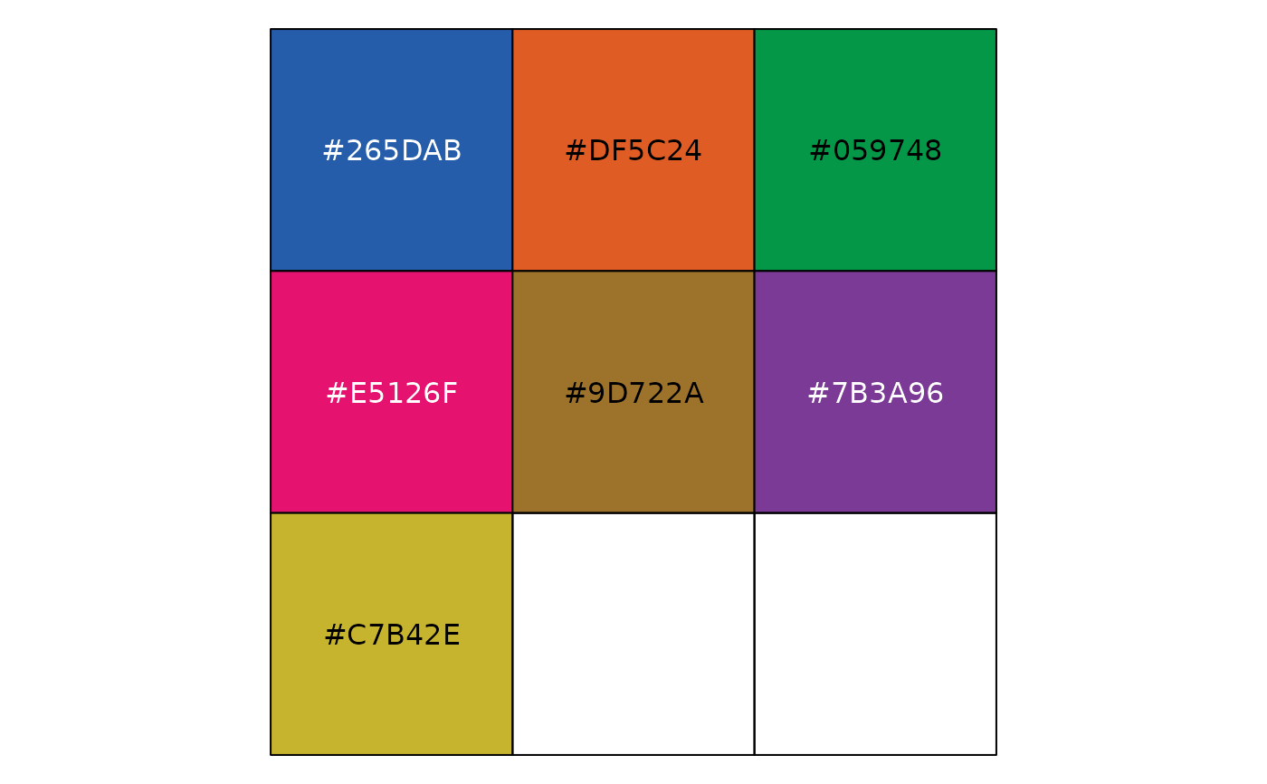 few_pal(palette = "Medium")Use the light palette for filled areas, such as bar charts. Use the medium palette for points and lines. Use the dark palette for highlighting specific points or for small and thin lines and points.