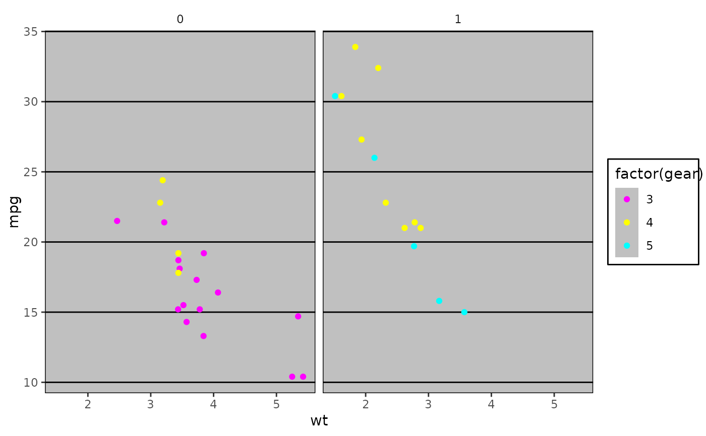 geom_point(aes(x = wt, y = mpg, colour = factor(gear))) +