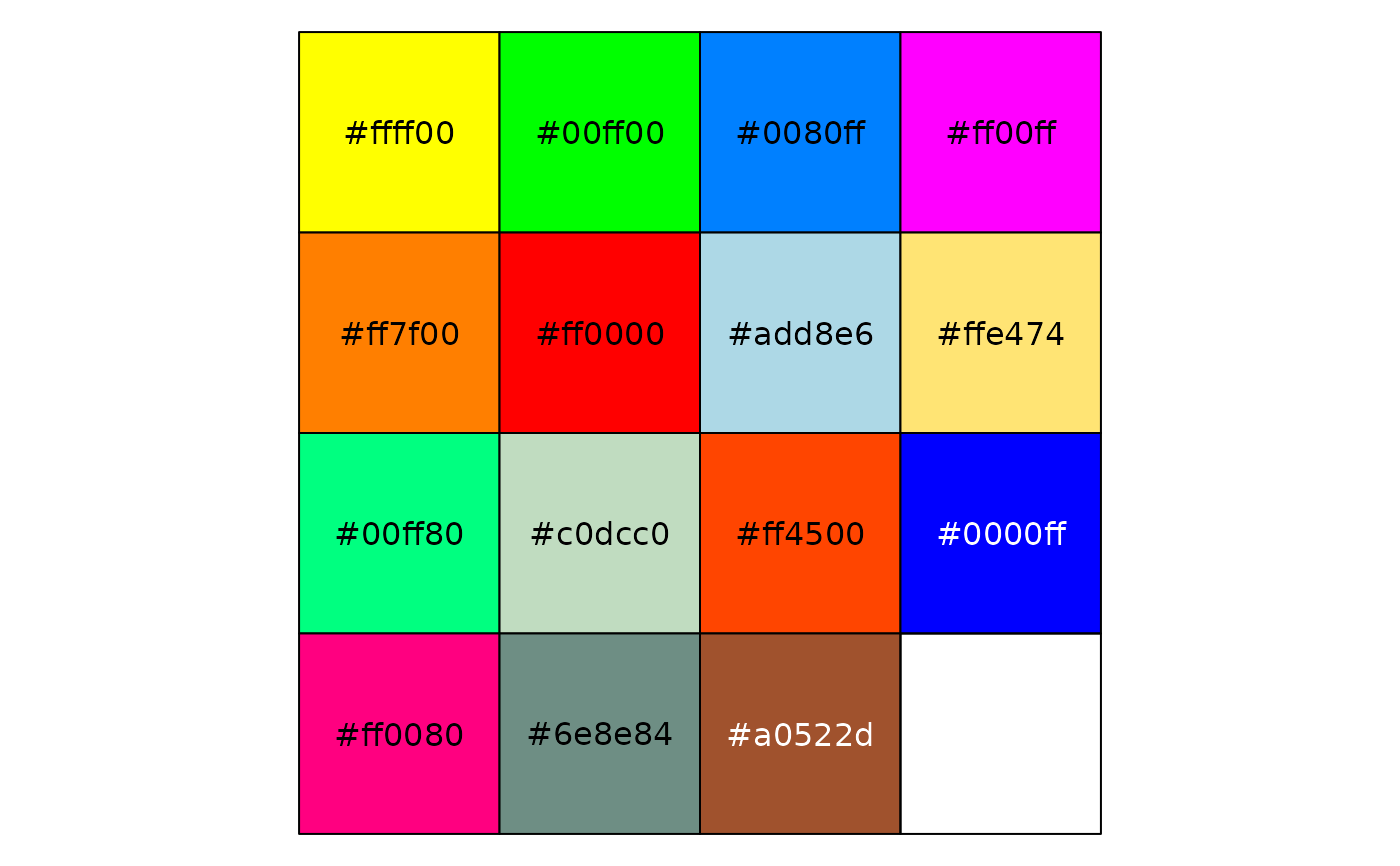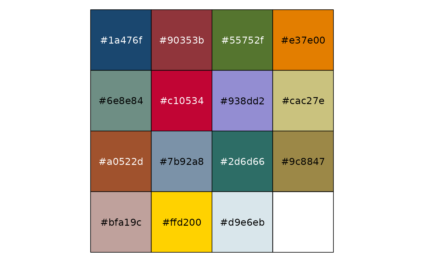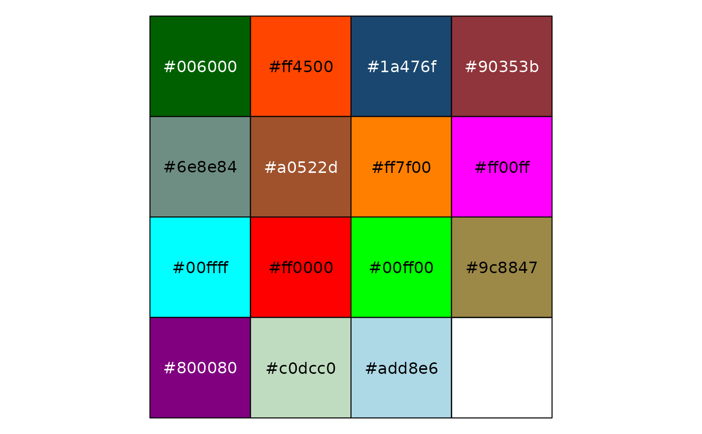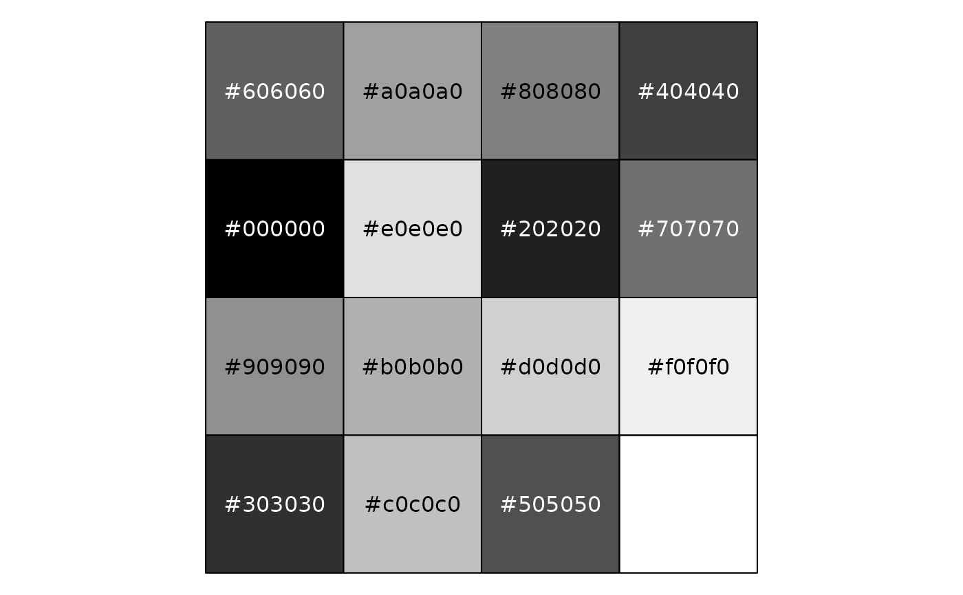 library("scales") show_col(stata_pal("s2color")(15)) show_col(stata_pal("s1rcolor")(15)) show_col(stata_pal("s1color")(15)) show_col(stata_pal("mono")(15))