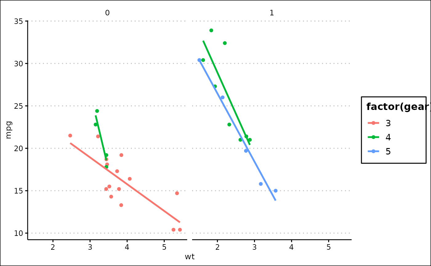 p <- ggplot(mtcars, aes(x = wt, y = mpg, colour = factor(gear))) +