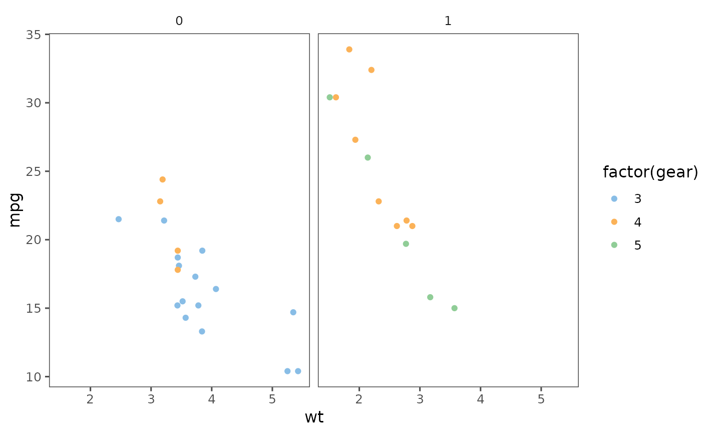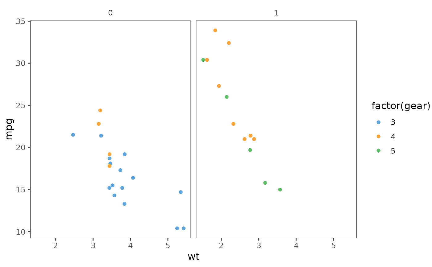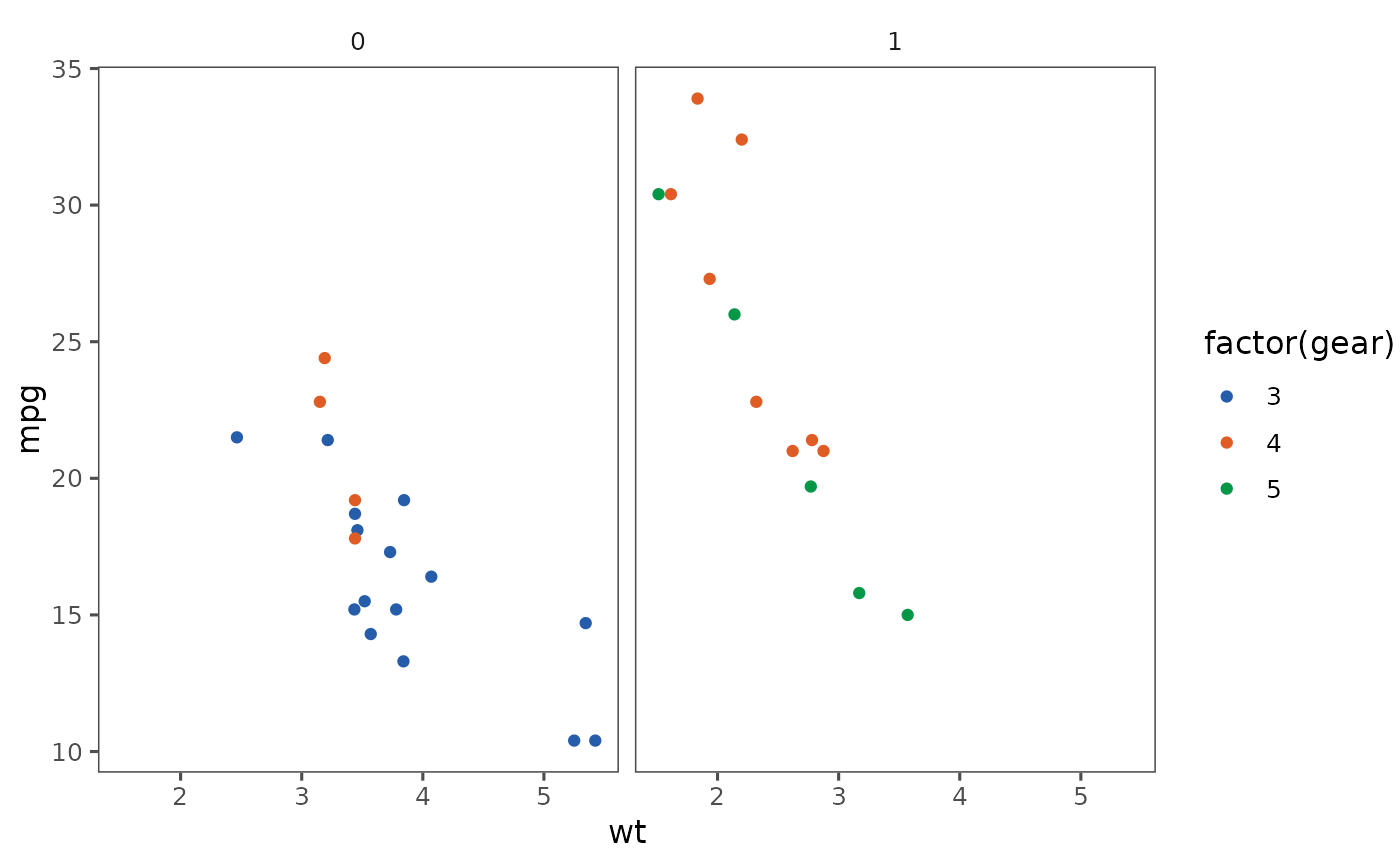 geom_point(aes(x = wt, y = mpg, colour = factor(gear))) +
