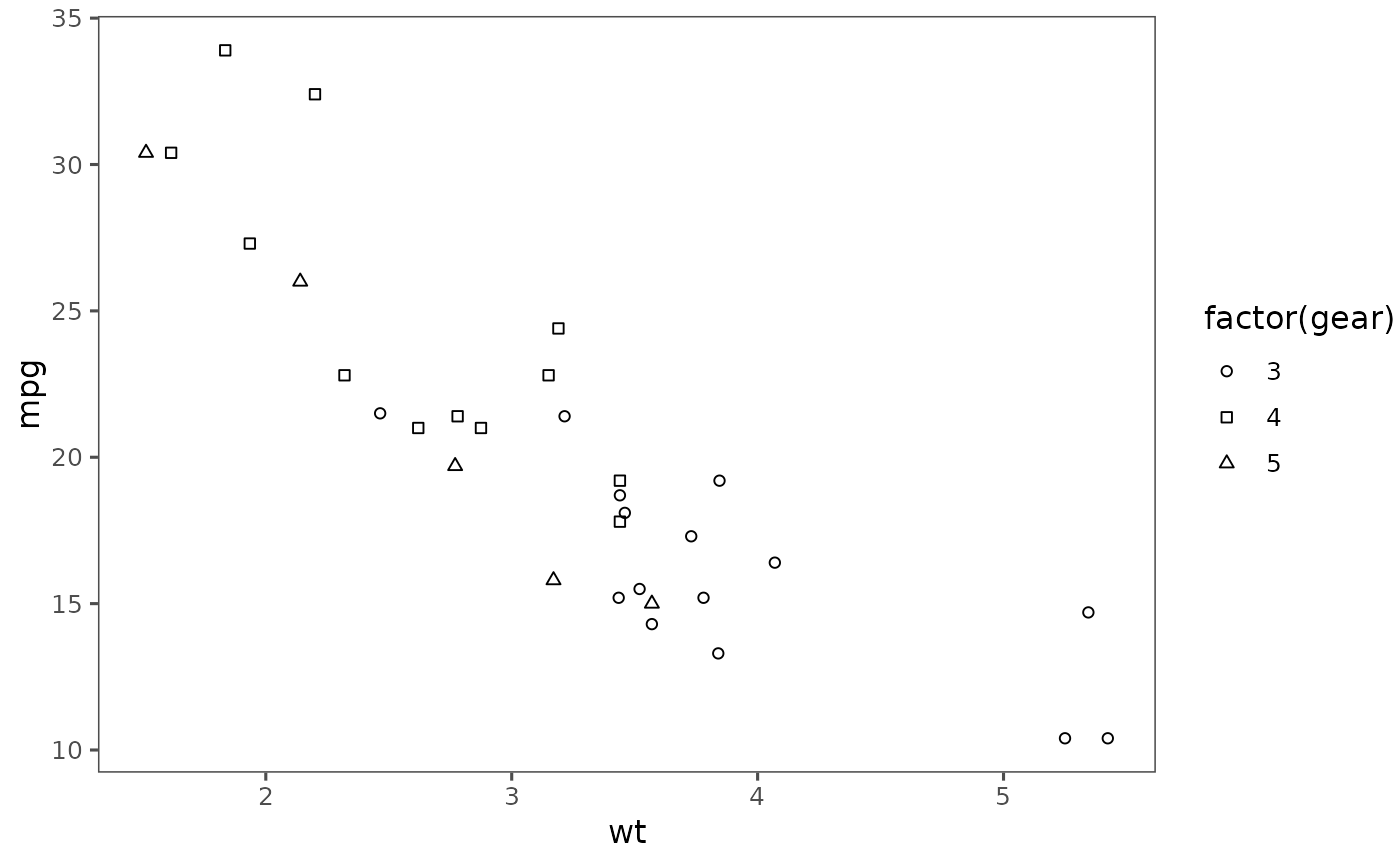 geom_point(aes(x = wt, y = mpg, shape = factor(gear))) +