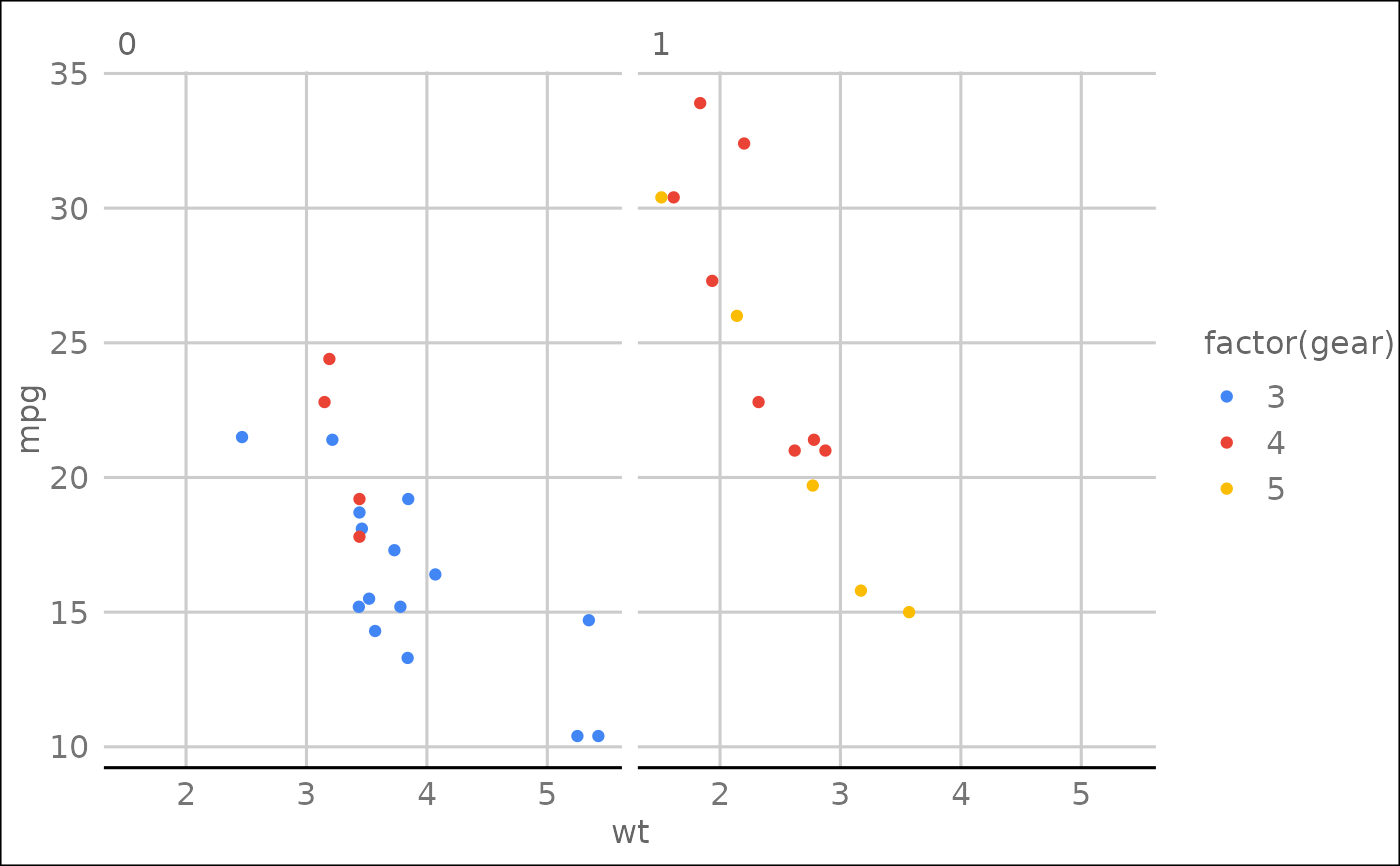 geom_point(aes(x = wt, y = mpg, colour = factor(gear))) +