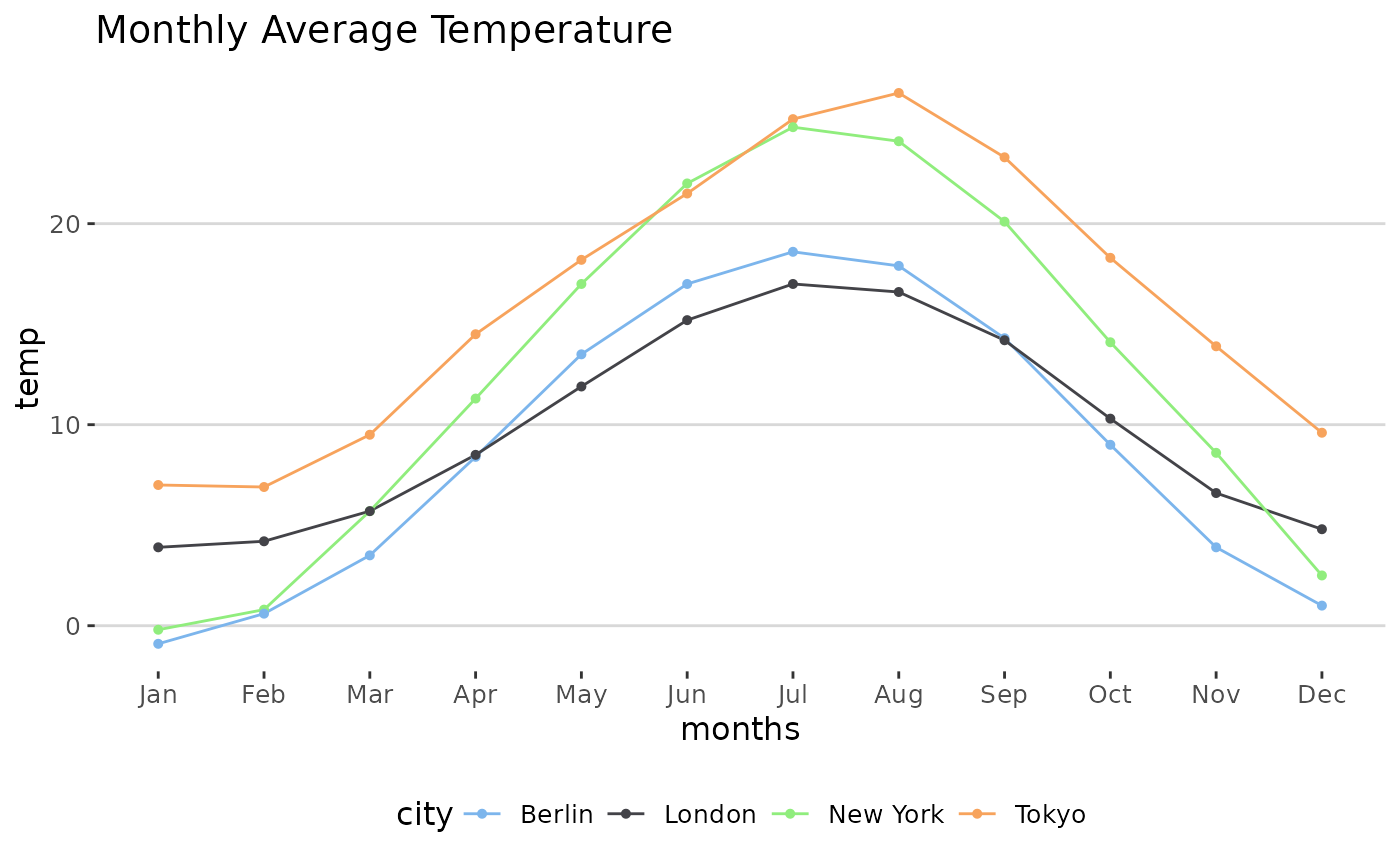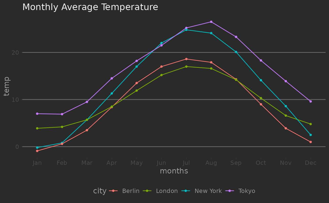 ggplot(dtemp, aes(x = months, y = temp, group = city, color = city)) +