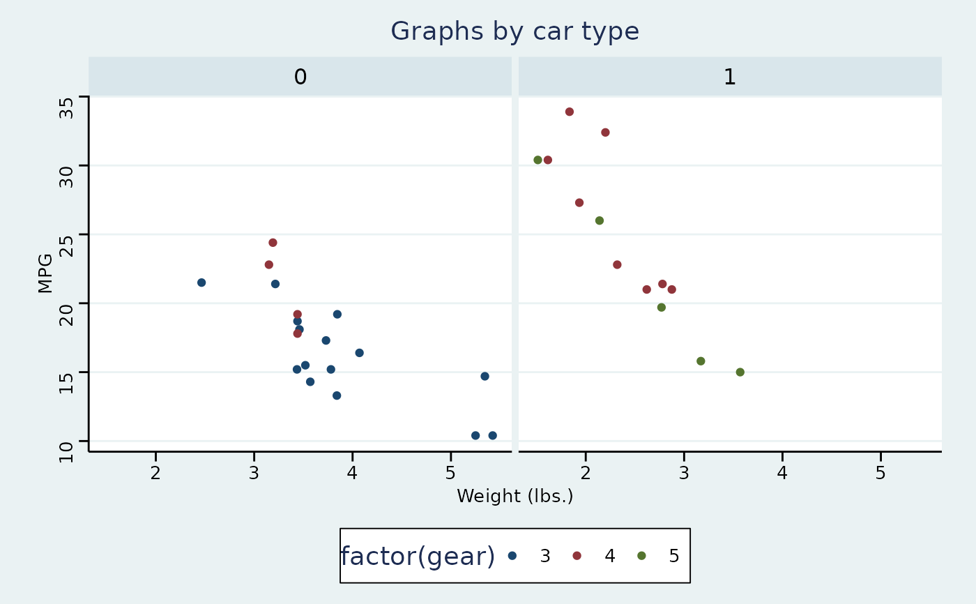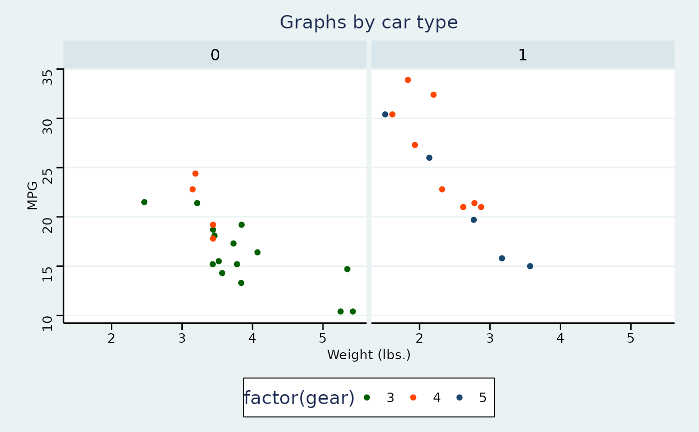 theme_stata(base_size = 11, base_family = "sans", scheme = "s2color")These themes approximate Stata schemes using the features ggplot2. The graphical models of Stata and ggplot2 differ in various ways that make an exact replication impossible (or more difficult than it is worth). Some features in Stata schemes not in ggplot2: defaults for specific graph types, different levels of titles, captions and notes. These themes also adopt some of the ggplot2 defaults, and more effort was made to match the colors and sizes of major elements than in matching the margins.