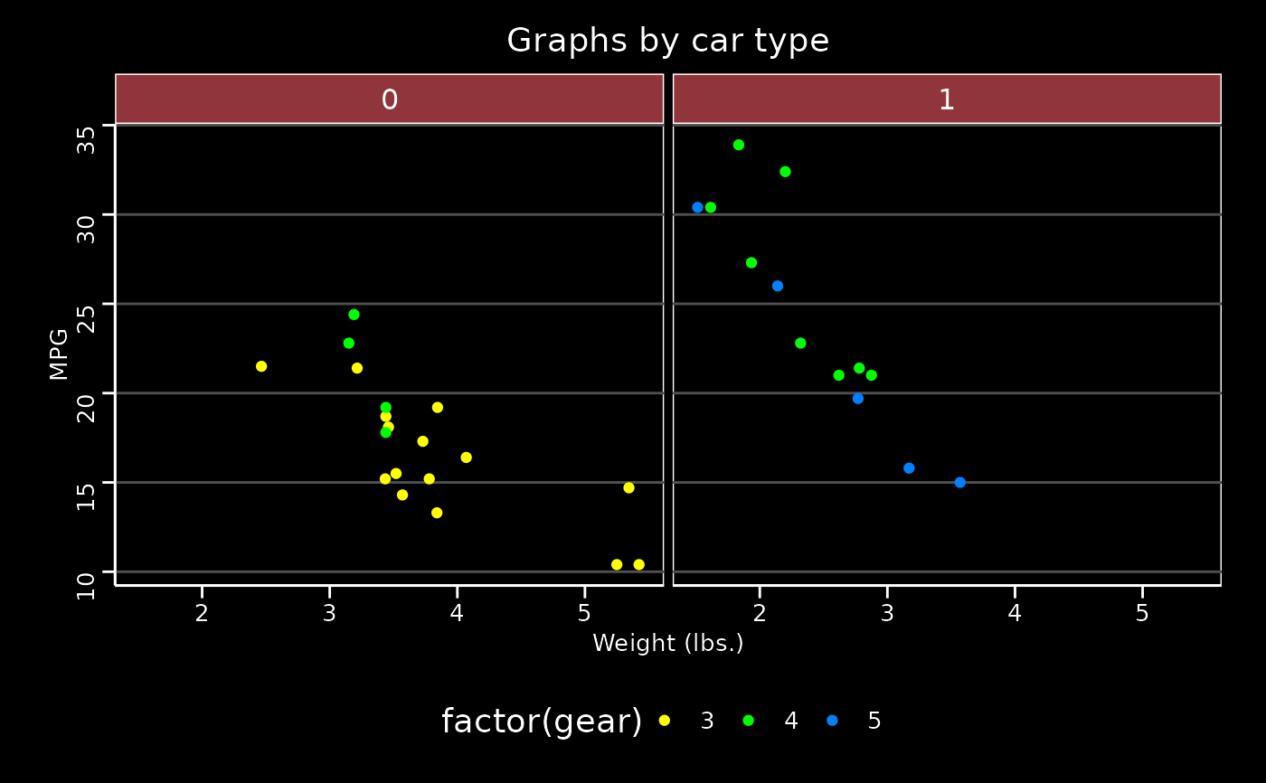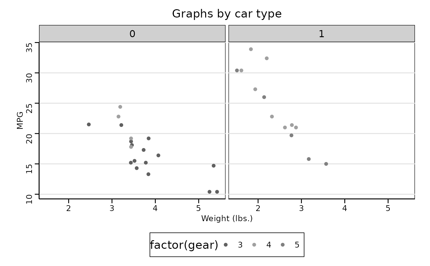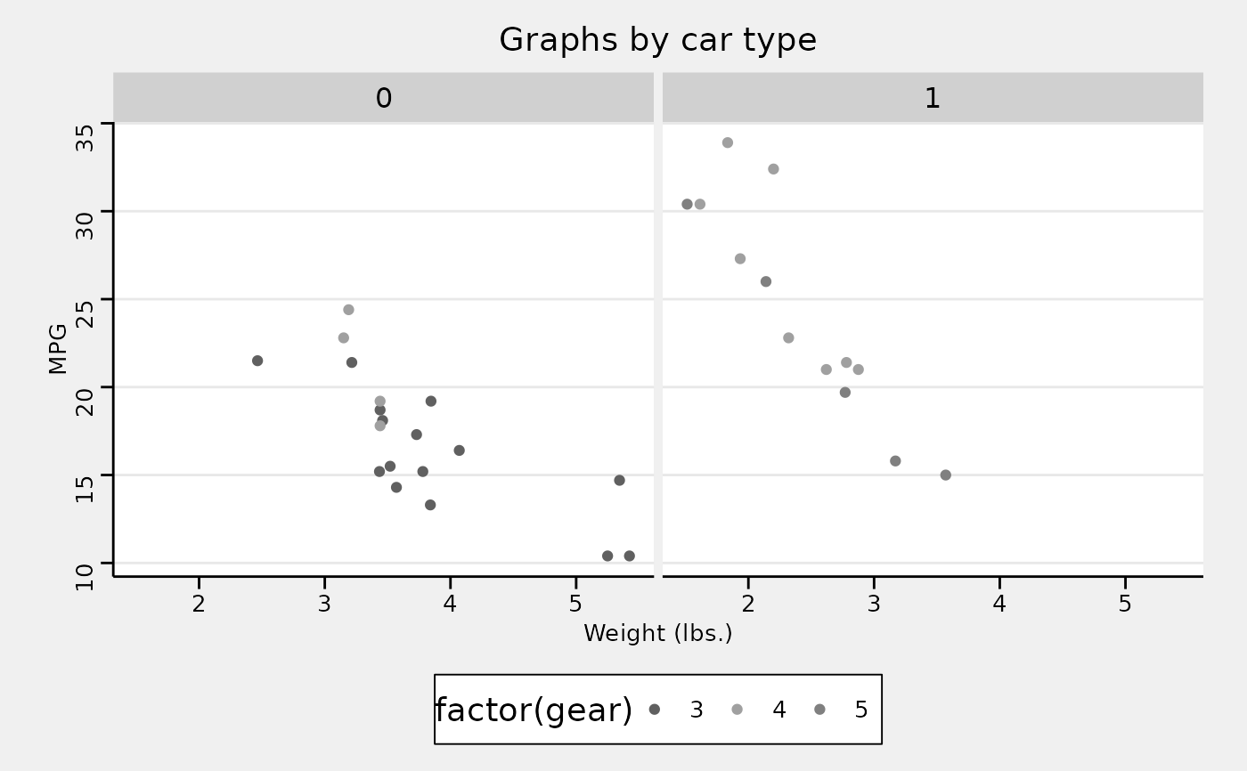 geom_point(aes(x = wt, y = mpg, colour = factor(gear))) +