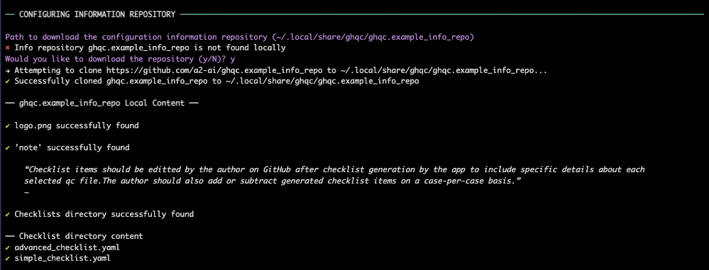 The custom configuration will default to installing to “~/.local/share/ghqc/”. To download to the default location, which is highly recommended, hit ENTER. Otherwise, type in the path in which to download the repository.
