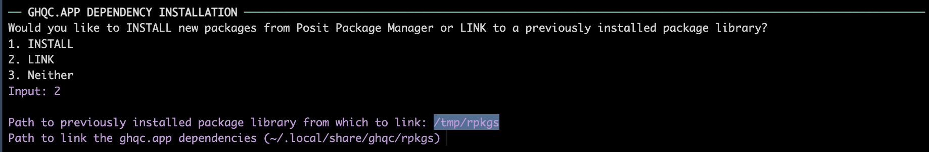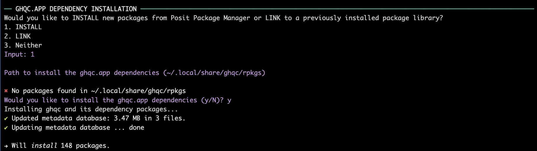 • The dependency packages are installed by default to “~/.local/share/ghqc/rpkgs///”. To install to the default location, which is highly recommended, hit ENTER. Otherwise, type in the path in which to install the dependency packages.