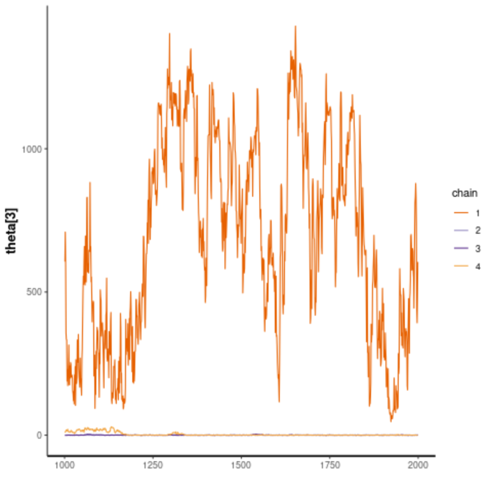 t3 <- system.time(m3 <- tmbstan(fm2$obj, seed = 101))Running this chain produces many warnings about divergent transitions, low effective sample size, etc.; the diagnostic table confirms this.