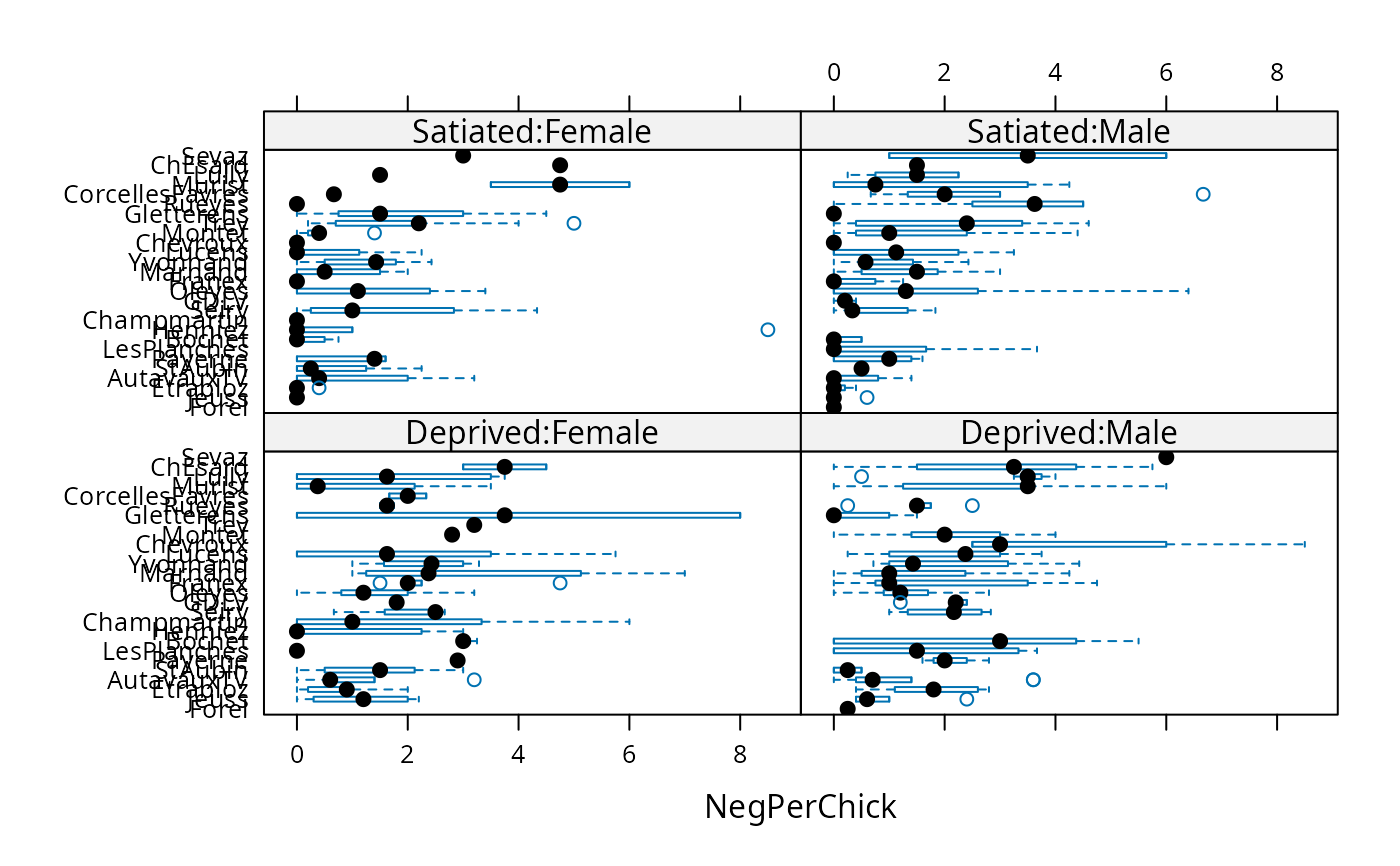 dotplot(reorder(Nest,NegPerChick) ~ NegPerChick| FoodTreatment:SexParent,