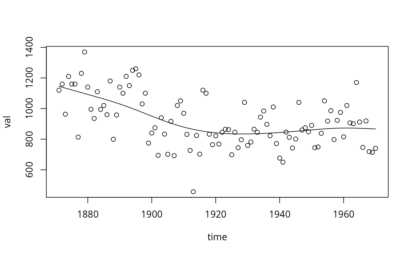ndat <- data.frame(time = c(time(Nile)), val = c(Nile))