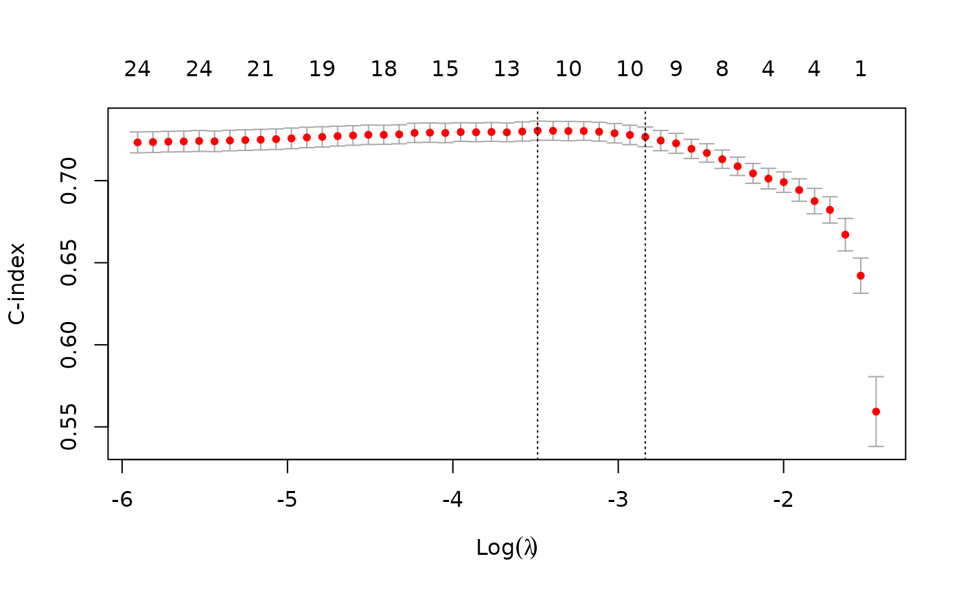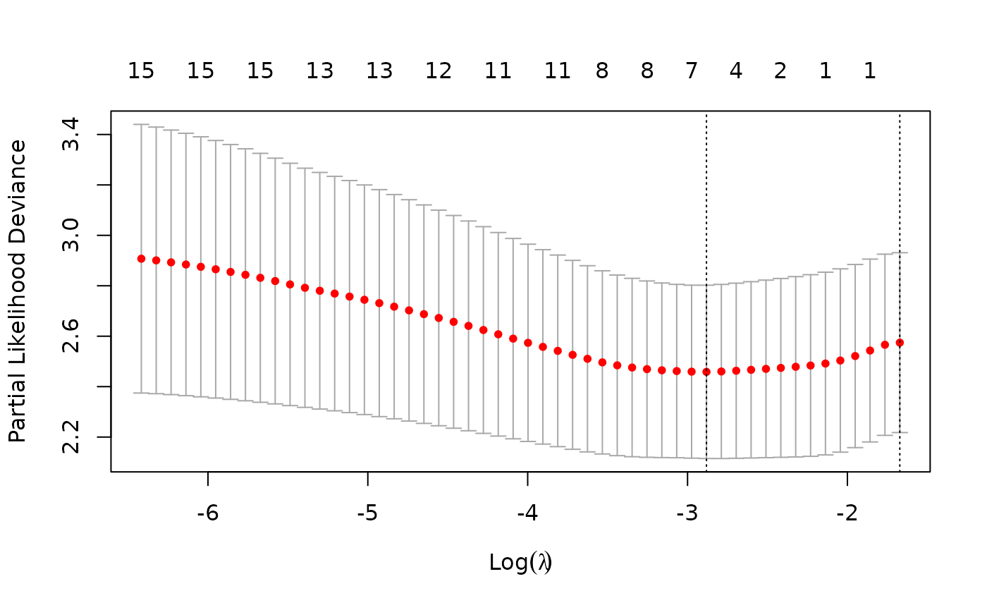## Call: survfit.cv.glmnet(formula = cv.fit, x = x, y = y2)