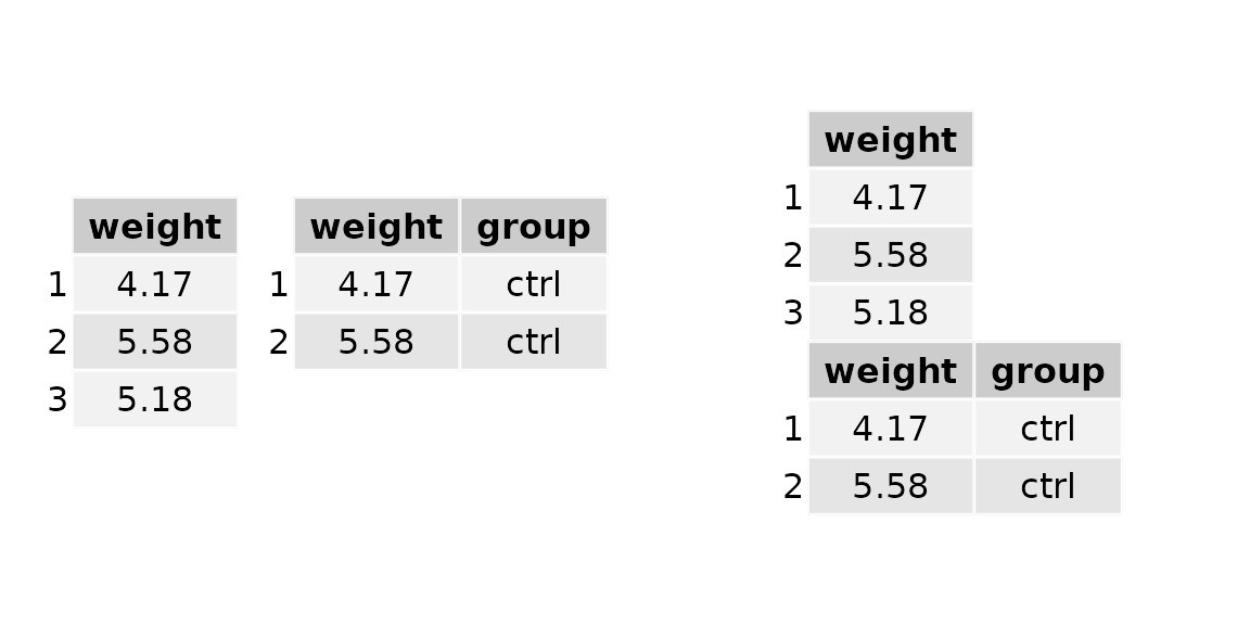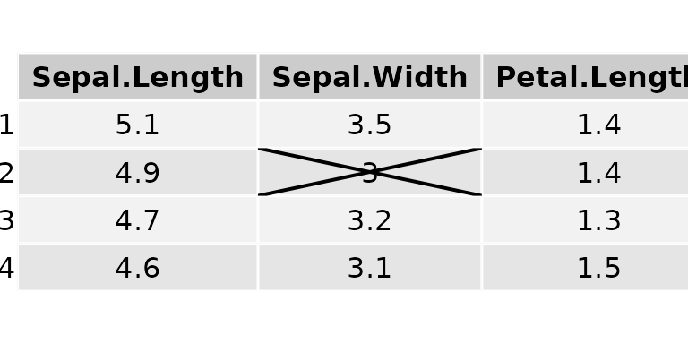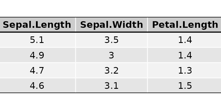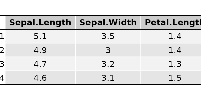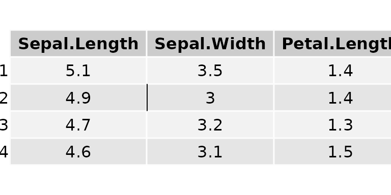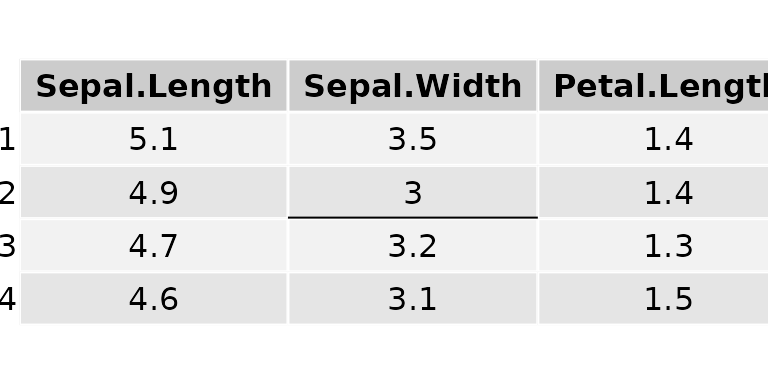 g <- g2 <- tableGrob(iris[1:4, 1:3], cols = NULL, rows=NULL)