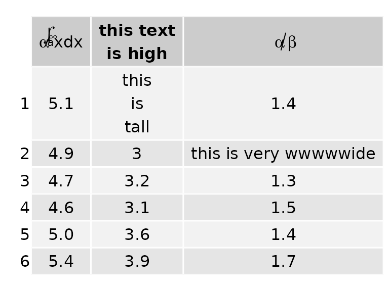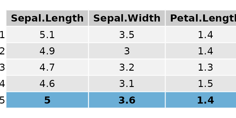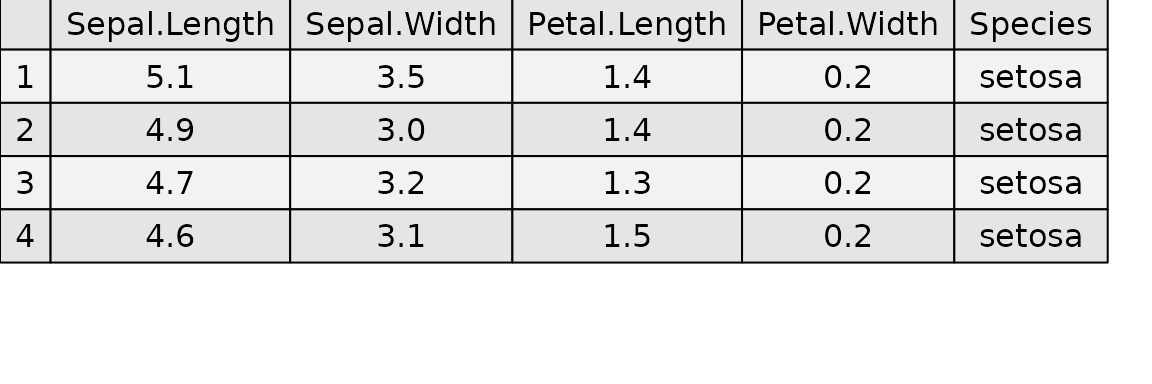 grid.ftable(head(iris, 4), gp = gpar(fill = rep(c("grey90", "grey95"), each = 6)))