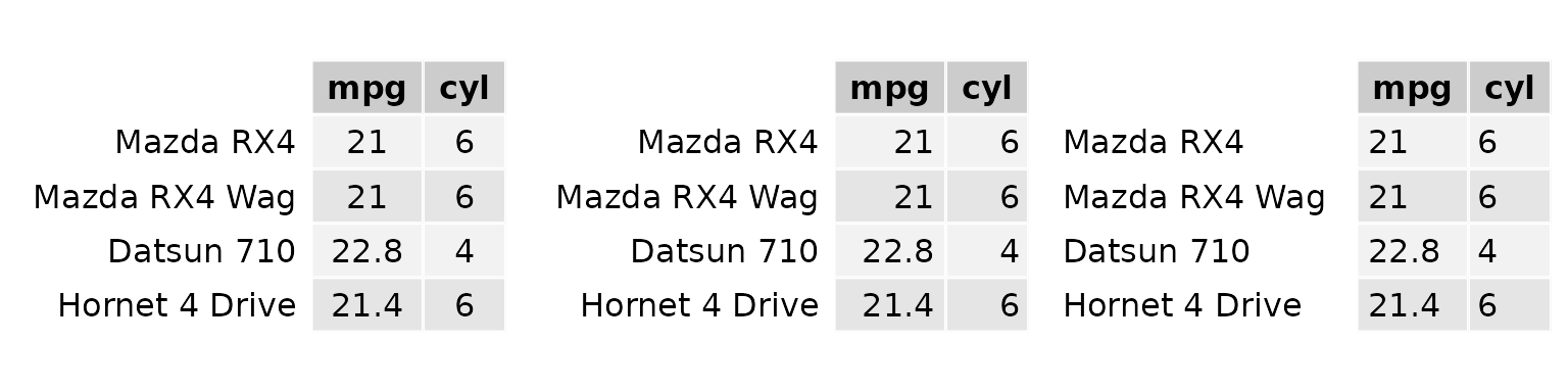 tableGrob(mtcars[1:4, 1:2], theme=tt2),