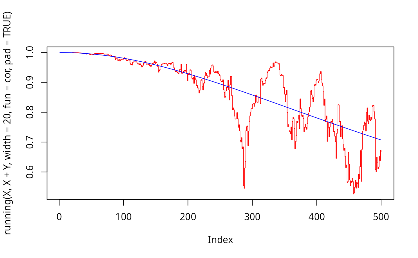 plot(running(X, X + Y, width = 20, fun = cor, pad = TRUE), col = "red", type = "s")