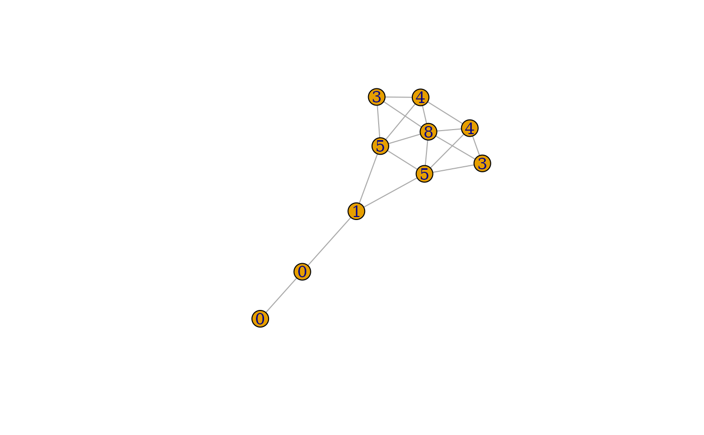 count_triangles(graph, vids = V(graph))For triangles() a numeric vector of vertex ids, the first three