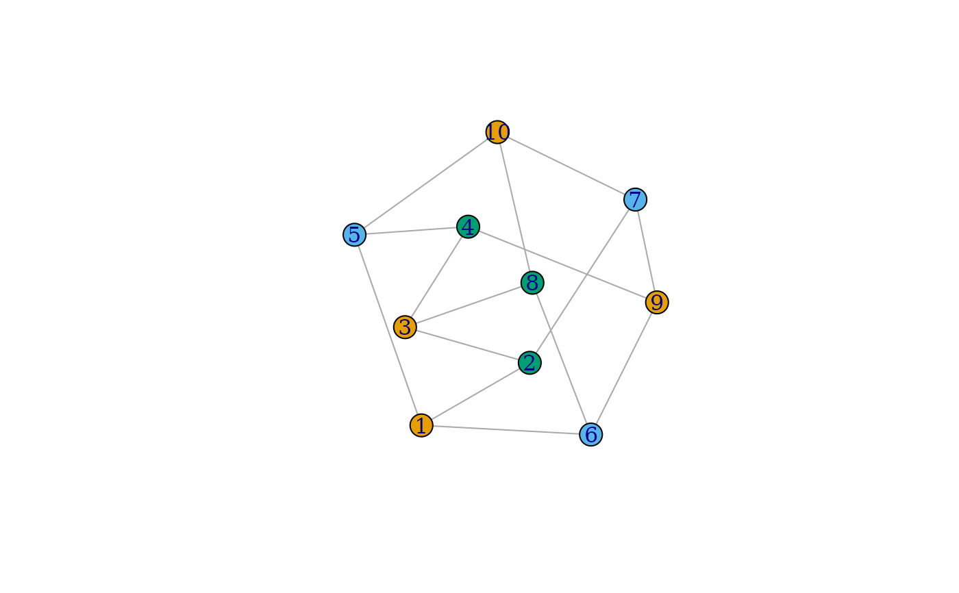 greedy_vertex_coloring(graph, heuristic = c("colored_neighbors", "dsatur"))The graph object to color.