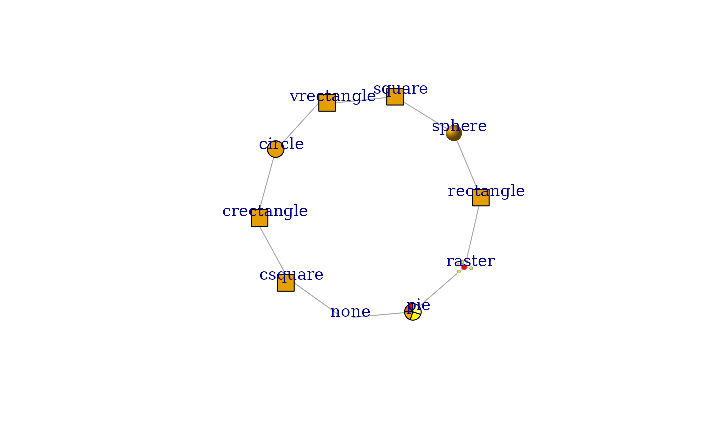 vertex.shape = shapes, vertex.label = shapes, vertex.label.dist = 1,