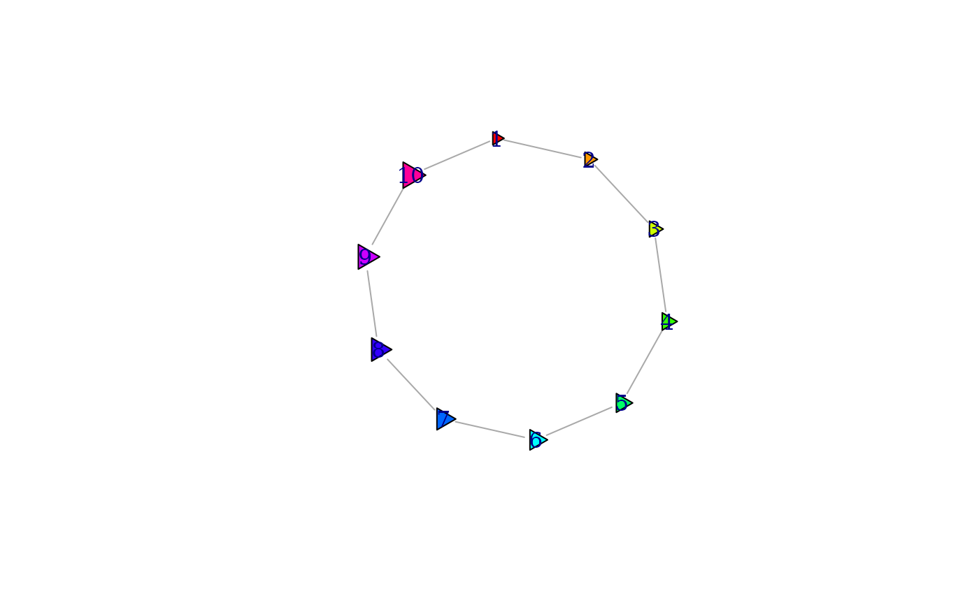 vertex.shape = "triangle", vertex.color = rainbow(vcount(g)),