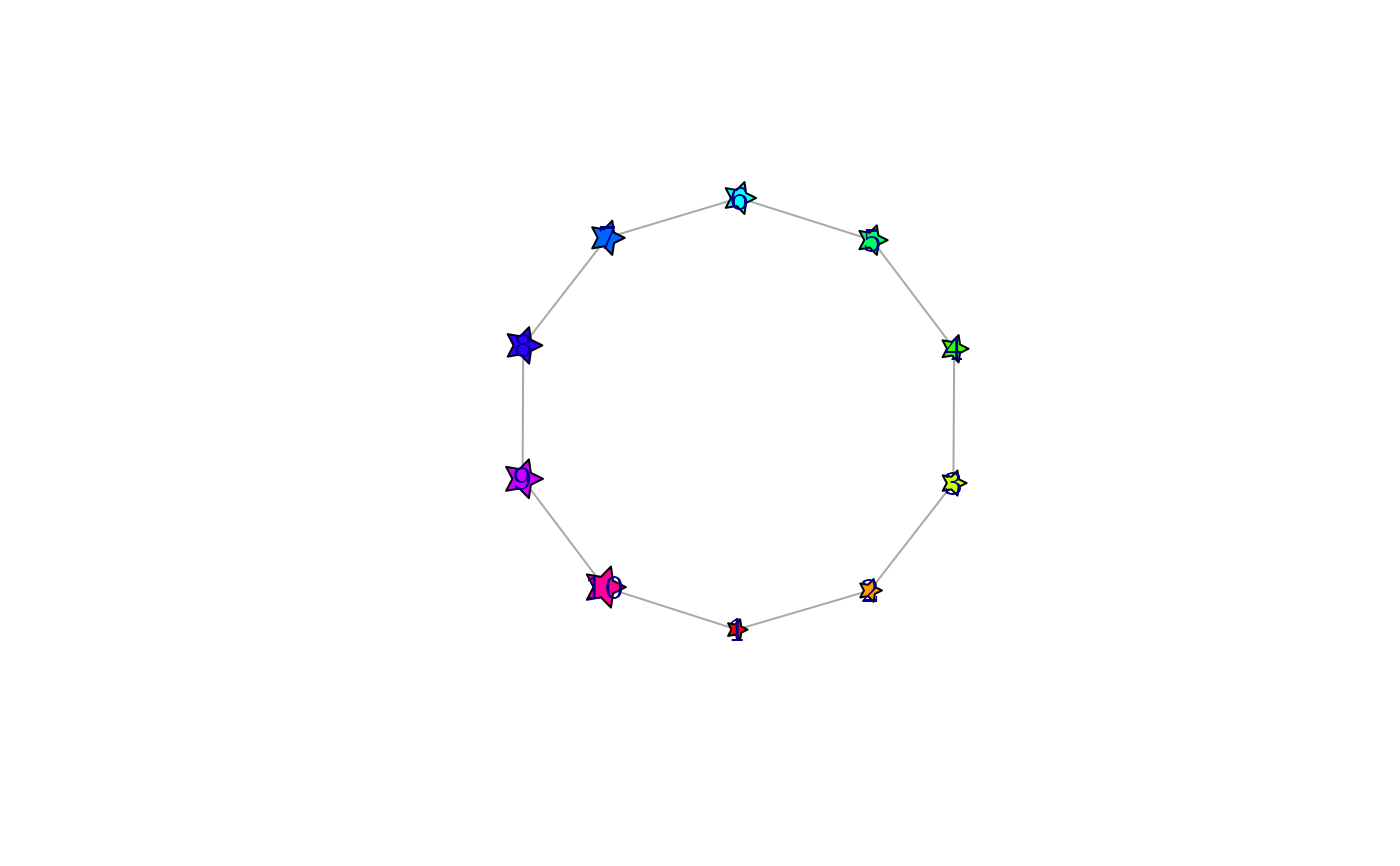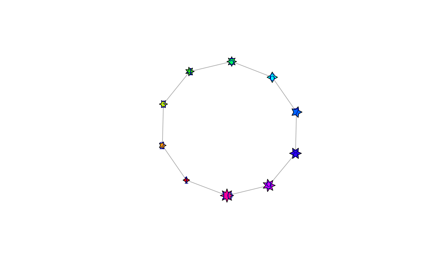 vertex.shape = "star", vertex.color = rainbow(vcount(g)),
