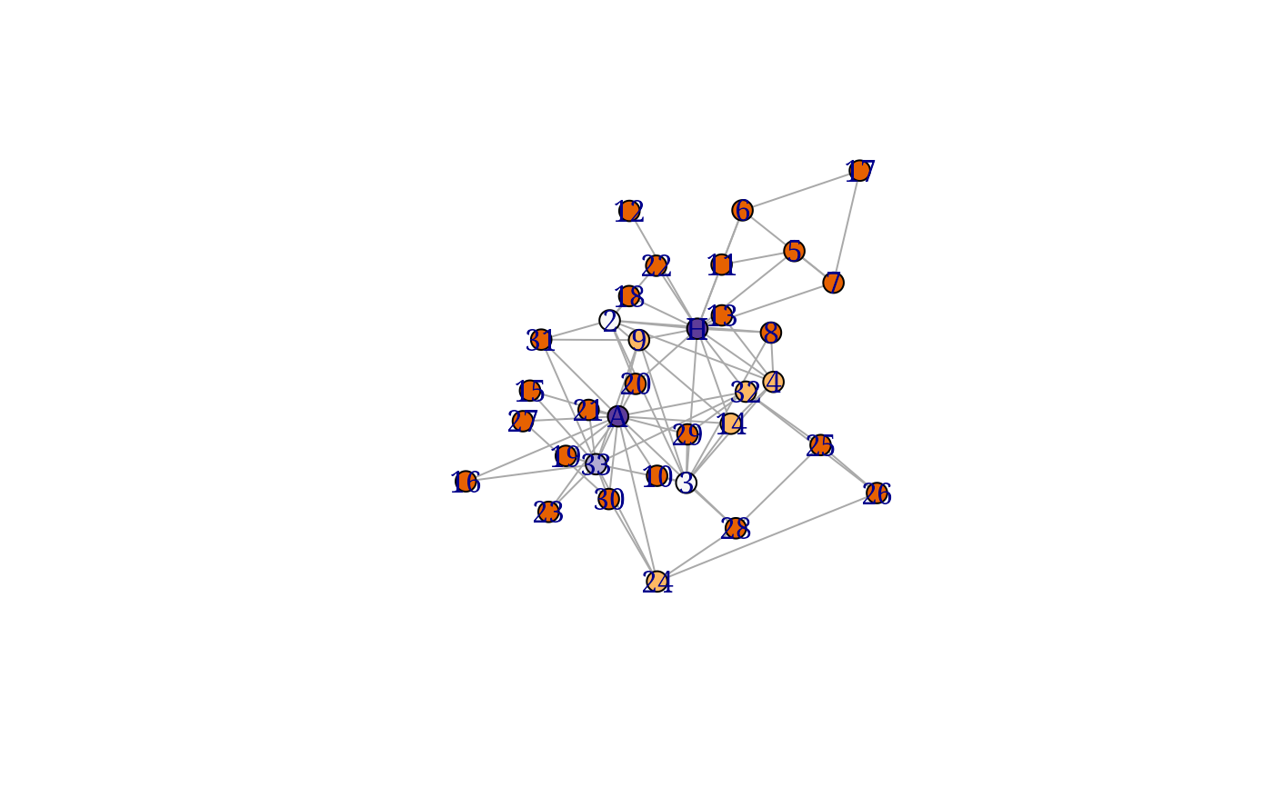 V(karate)$color <- scales::dscale(degree(karate) %>% cut(5), diverging_pal)