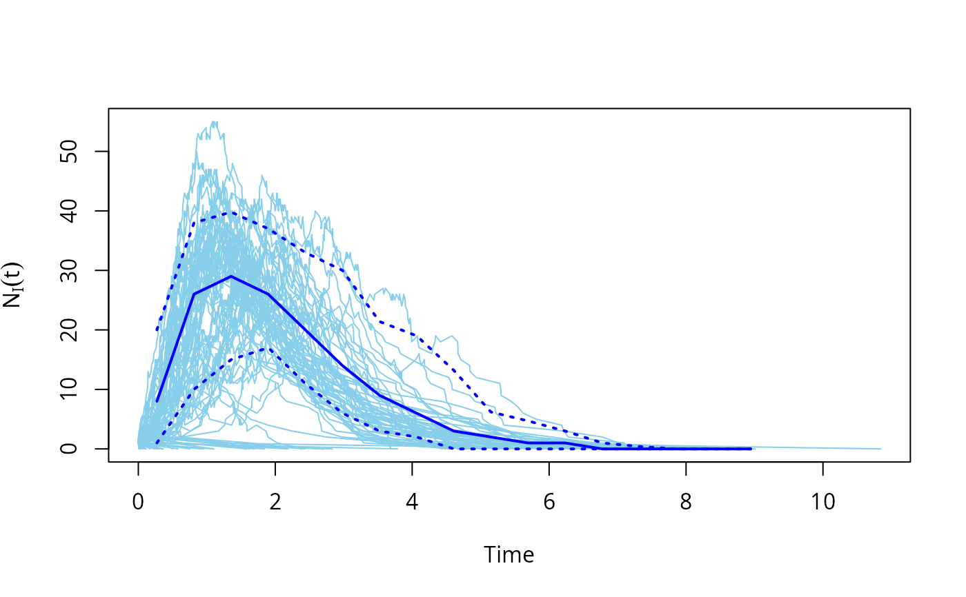 The number of susceptible/infected/recovered individuals is plotted over time, for multiple simulations.