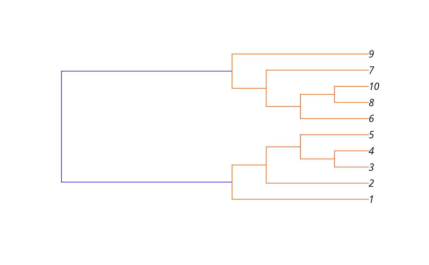 plot_dendrogram(x, mode="phylo", colbar = rainbow(11, start=0.7,