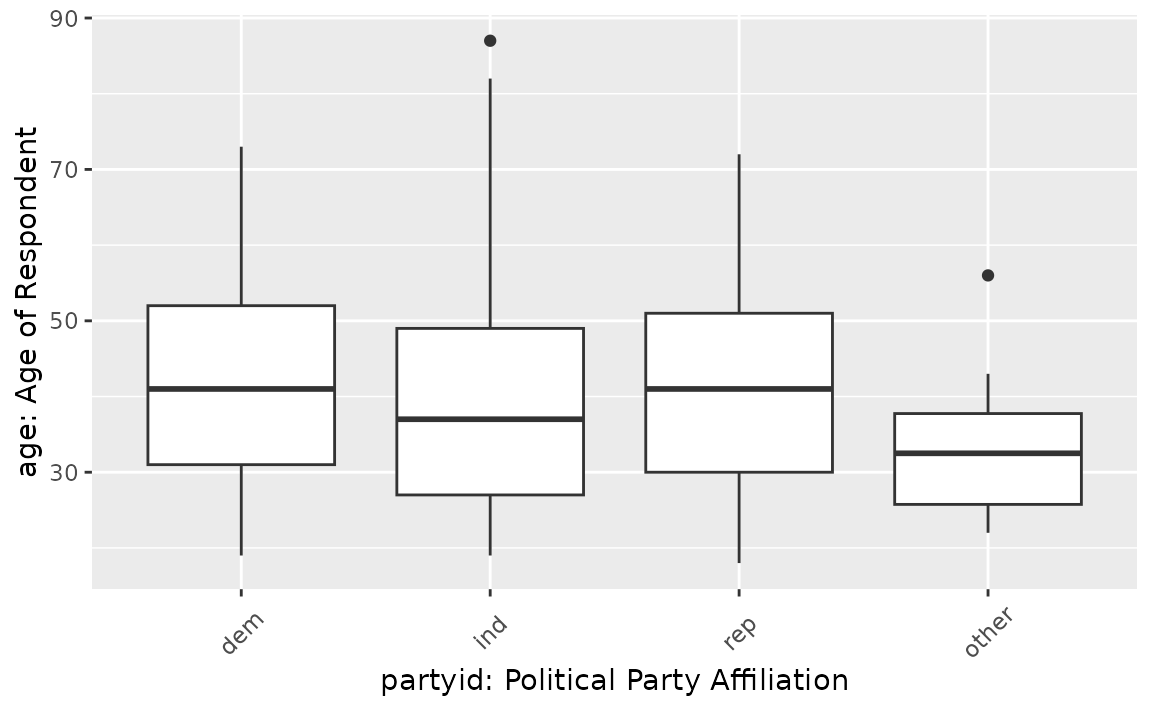 To carry out an ANOVA, we’ll examine the association between age and political party affiliation in the United States. The age variable is a numerical variable measuring the respondents’ age at the time that the survey was taken, and partyid is a factor variable with unique values ind, rep, dem, other.