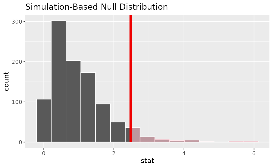 To get a sense for what this distribution looks like, and where our observed statistic falls, we can use visualize():
