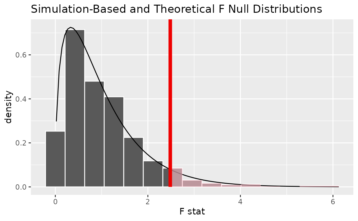 Note that, while the observed statistic stays the same, the resulting p-value differs slightly between these two approaches since the randomization-based empirical distribution is an approximation of the true distribution.