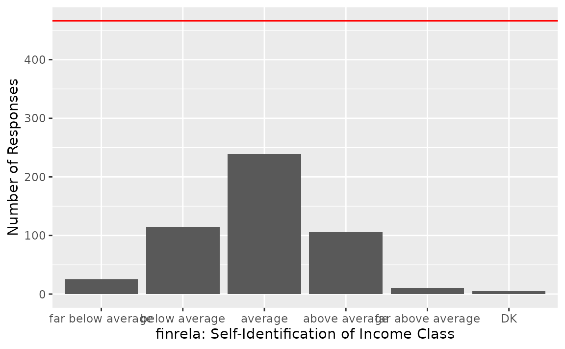 It seems like a uniform distribution may not be the most appropriate description of the data–many more people describe their income as average than than any of the other options. Lets now test whether this difference in distributions is statistically significant.