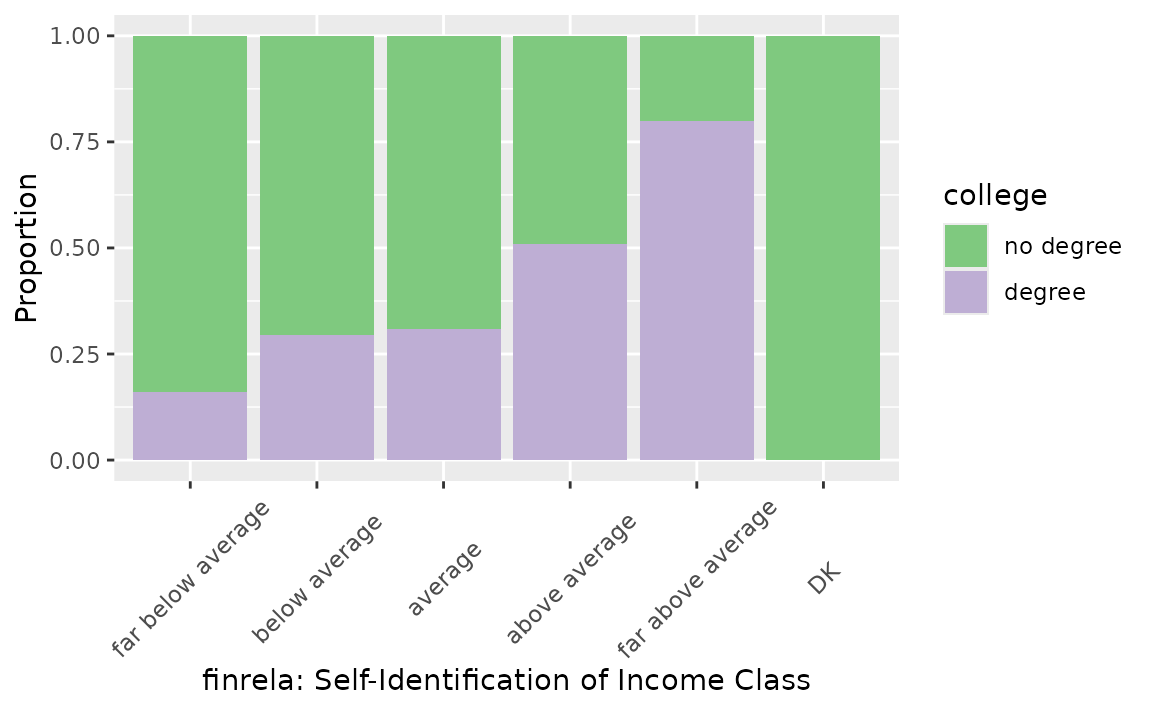 To carry out a chi-squared test of independence, we’ll examine the association between income and educational attainment in the United States. college is a categorical variable with values degree and no degree, indicating whether or not the respondent has a college degree (including community college), and finrela gives the respondent’s self-identification of family income—either far below average, below average, average, above average, far above average, or DK (don’t know).