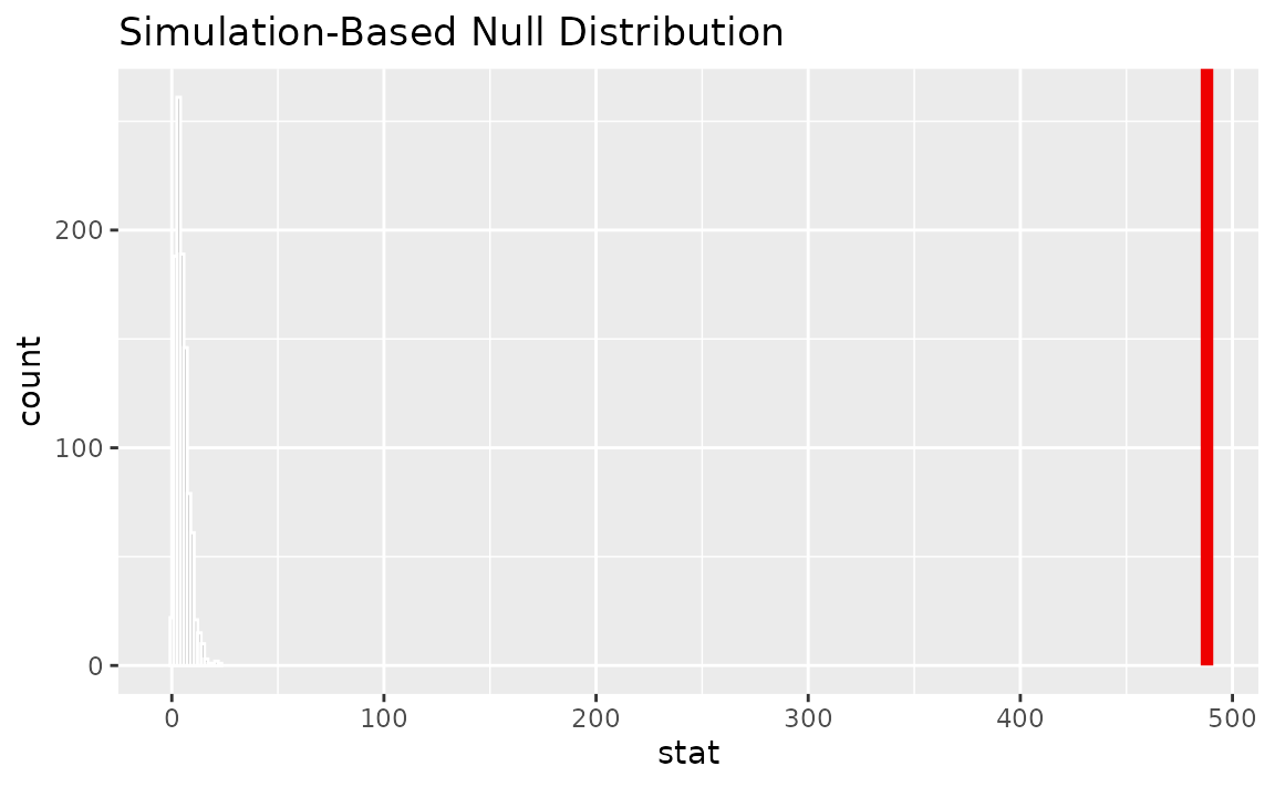 calculate(stat = "Chisq")The observed statistic is 487.984. Now, generating a null distribution, by just dropping in a call to generate():