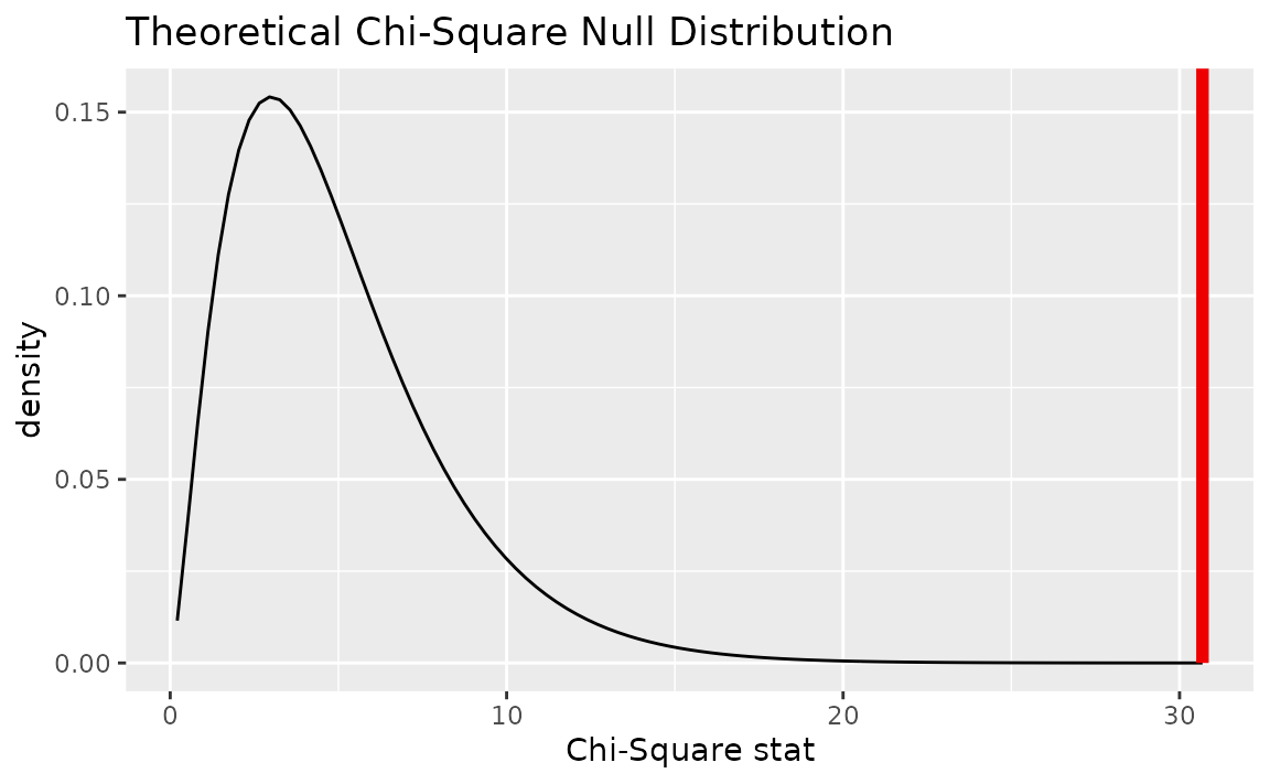 Note that, equivalently to the theory-based approach shown above, the package supplies a wrapper function, chisq_test, to carry out Chi-Squared tests of independence on tidy data. The syntax goes like this: