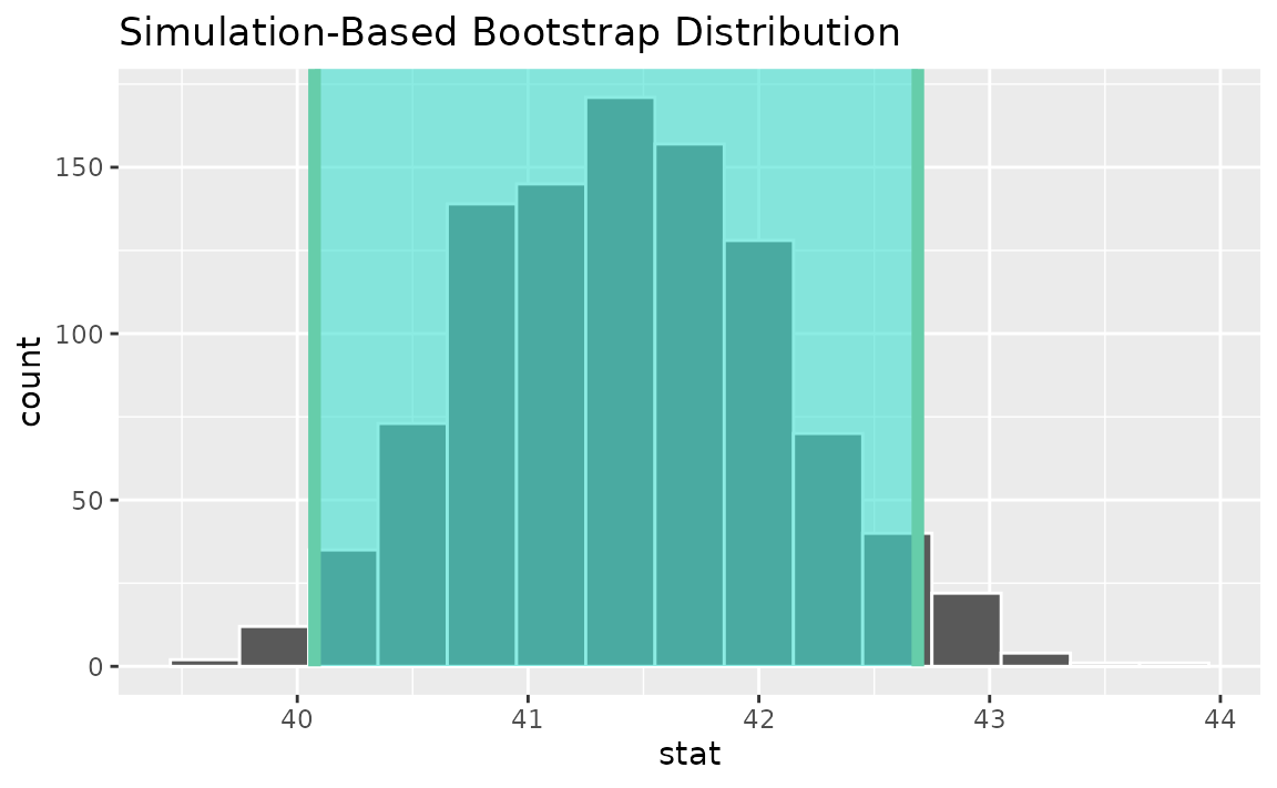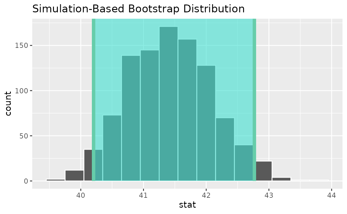 calculate(stat = "mean")Use the bootstrap distribution to find a confidence interval,