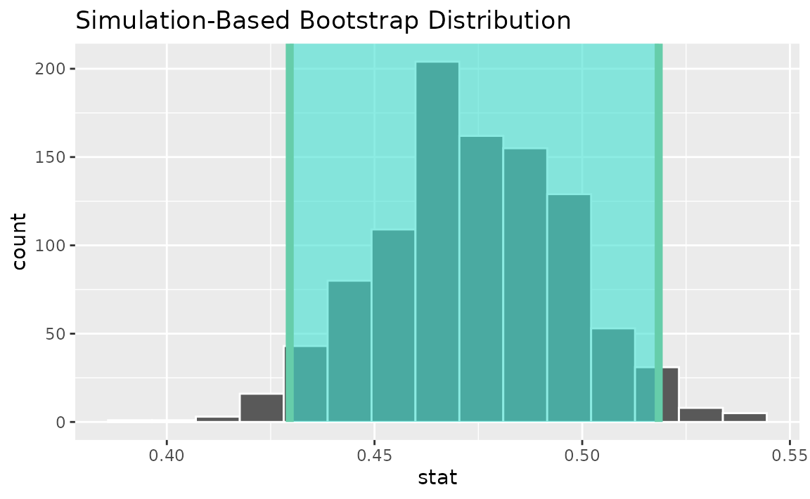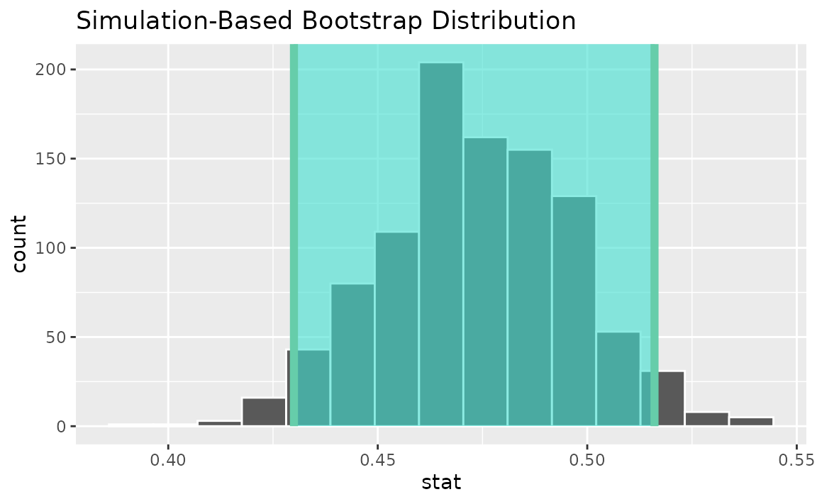 calculate(stat = "prop")Use the bootstrap distribution to find a confidence interval,