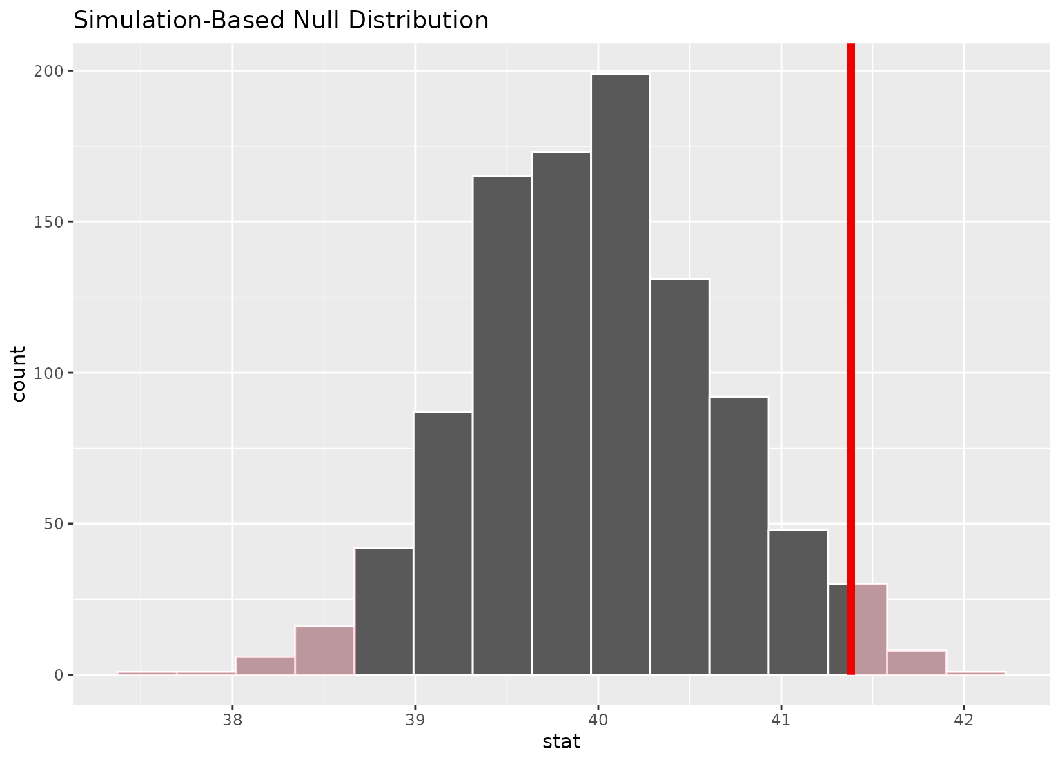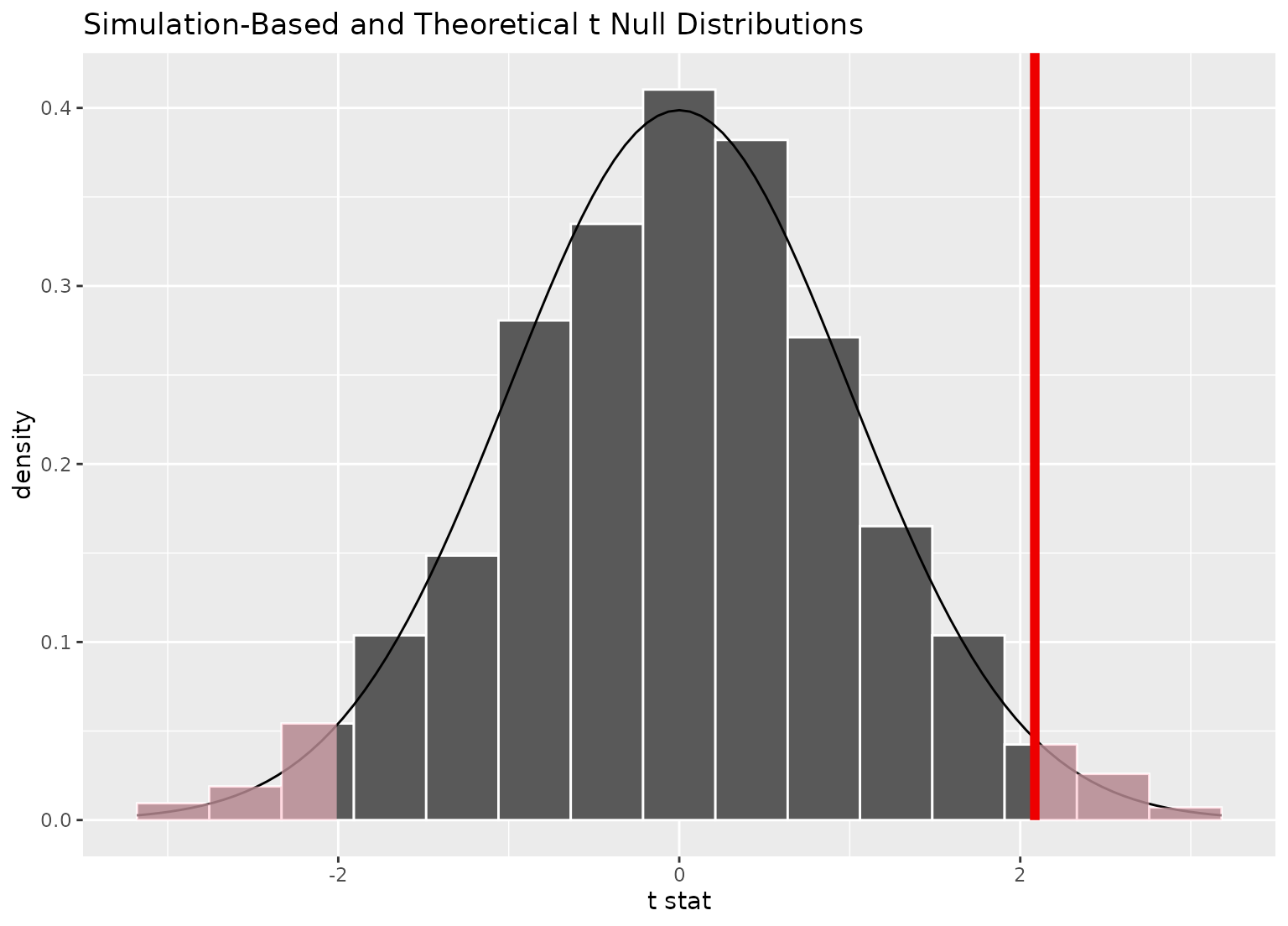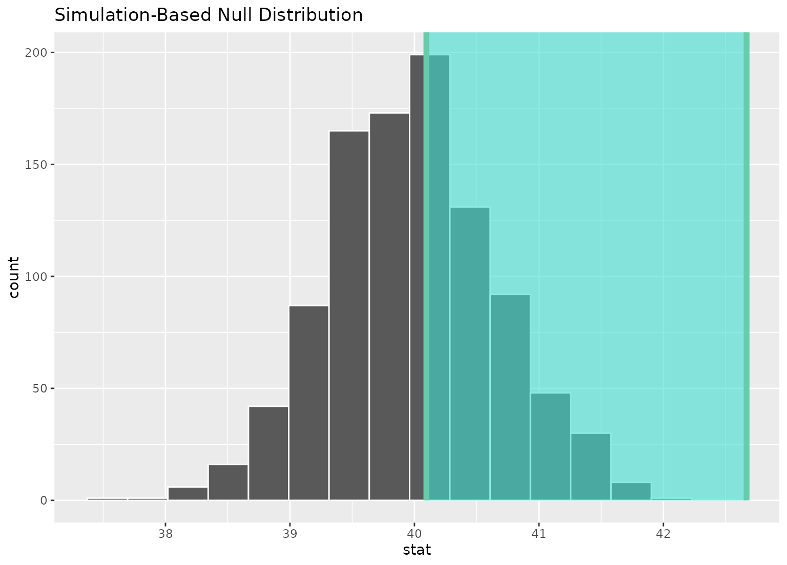 Visualize the distribution of the simulation-based inferential statistics or the theoretical distribution (or both!).