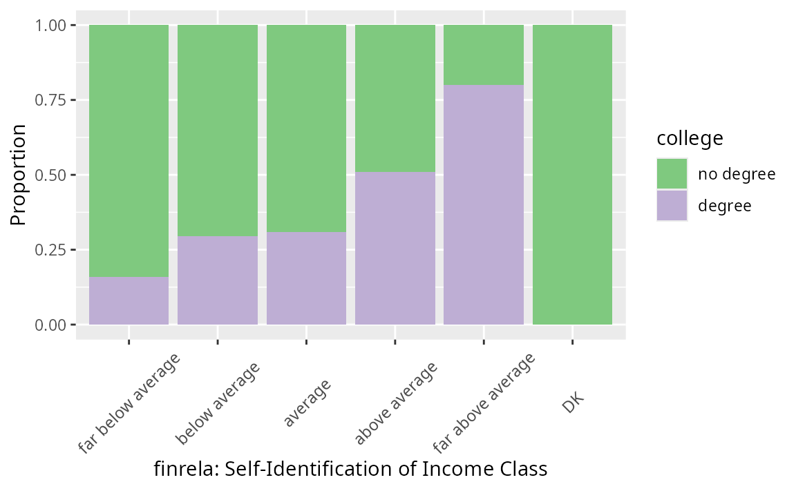 chisq_test(gss, college ~ finrela)## # A tibble: 1 × 3