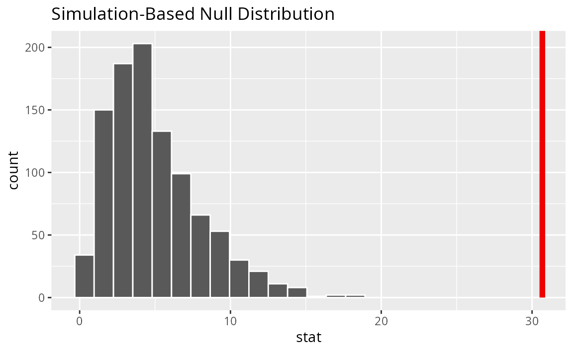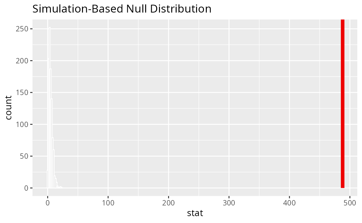 calculate(stat = "Chisq")The observed statistic is 487.984. Now, generating a null