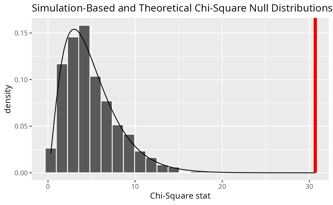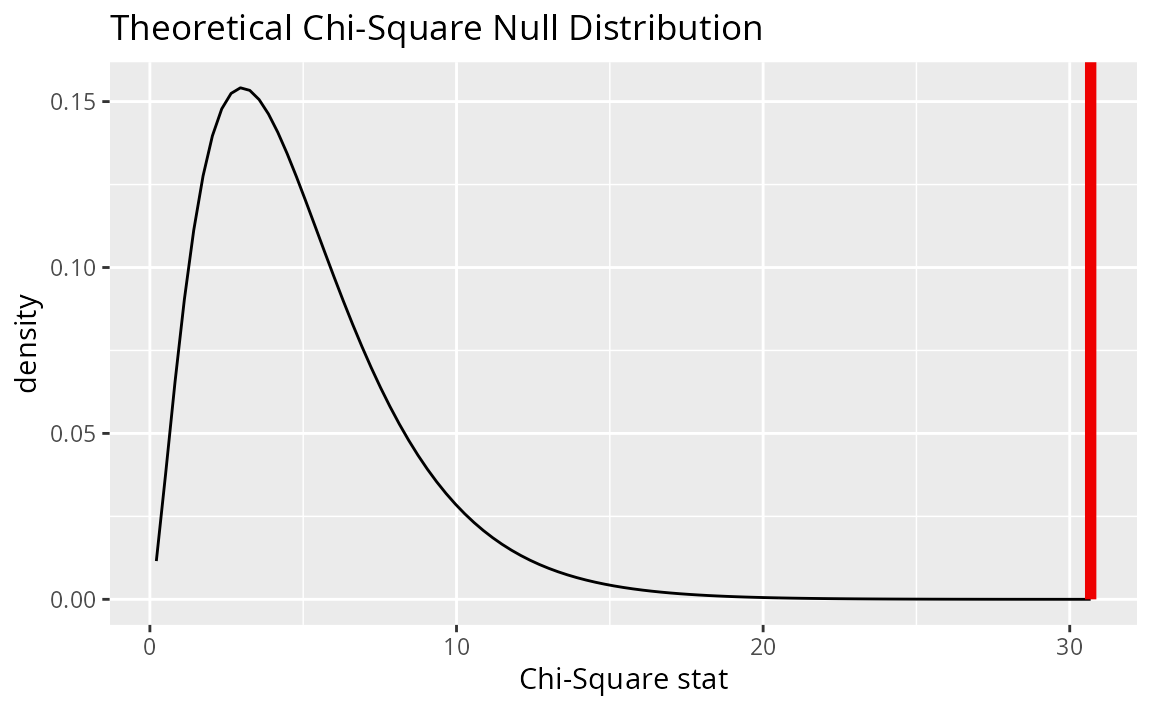 calculate(stat = "Chisq")The observed statistic is 30.6825. Now, we want to compare this statistic to a null distribution, generated under the assumption that these variables are not actually related, to get a sense of how likely it would be for us to see this observed statistic if there were actually no association between education and income.