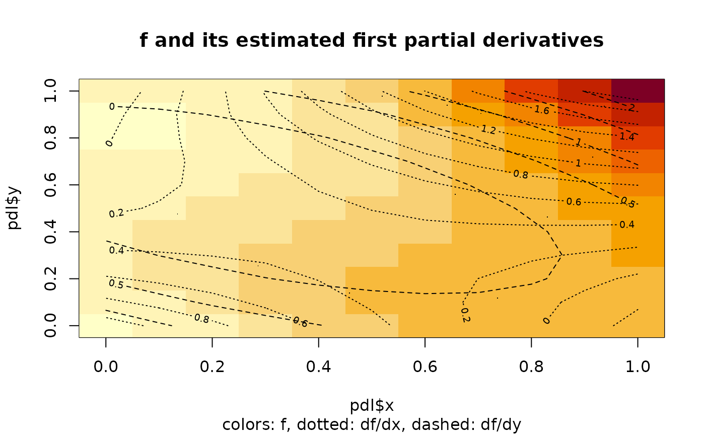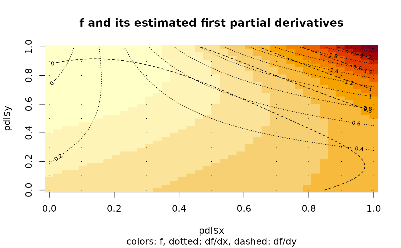image(pdl$x,pdl$y,pdl$z,main="f and its estimated first partial derivatives",