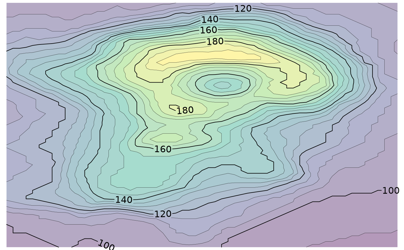 lines <- isolines(x, y, volcano, 5*(19:38))
