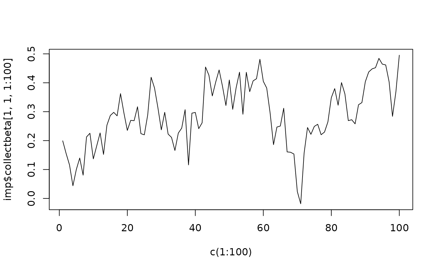 plot(c(1:100),imp$collectbeta[1,1,1:100],type="l")