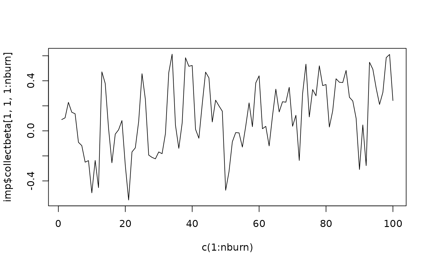imp<-jomo1cat.MCMCchain(Y.cat,Y.numcat,X,beta.start,l1cov.start,l1cov.prior,nburn=nburn)