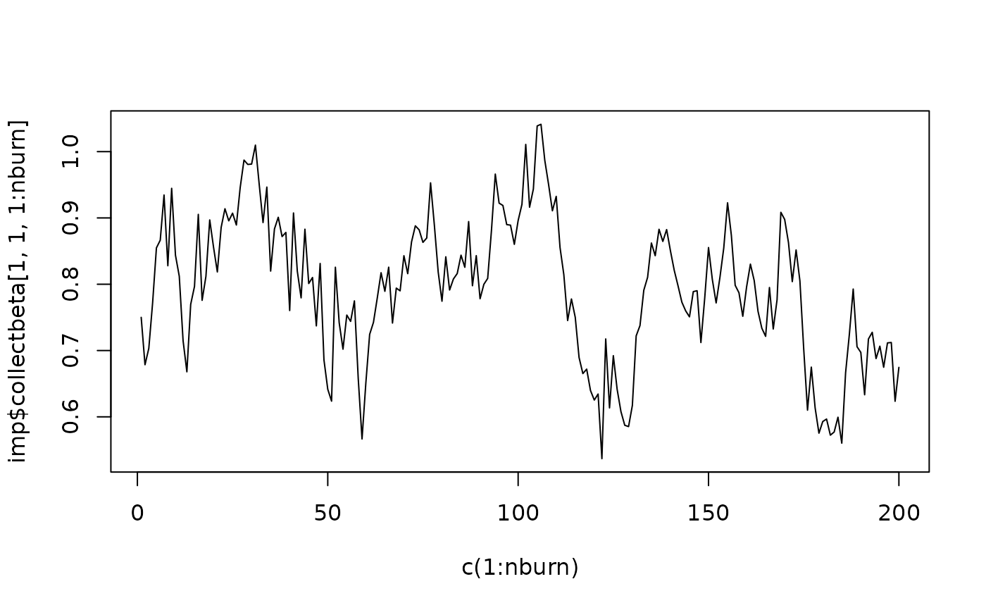 plot(c(1:nburn),imp$collectbeta[1,1,1:nburn],type="l")