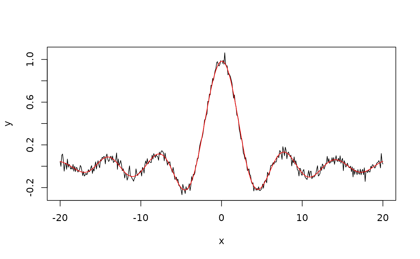 y <- sin(x)/x + rnorm(401,sd=0.03)