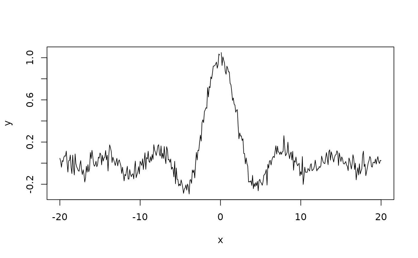 y <- sin(x)/x + rnorm(401,sd=0.05)