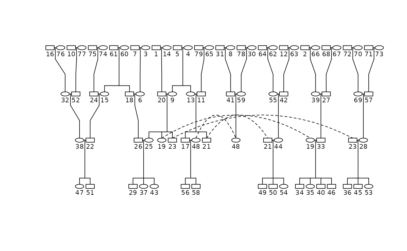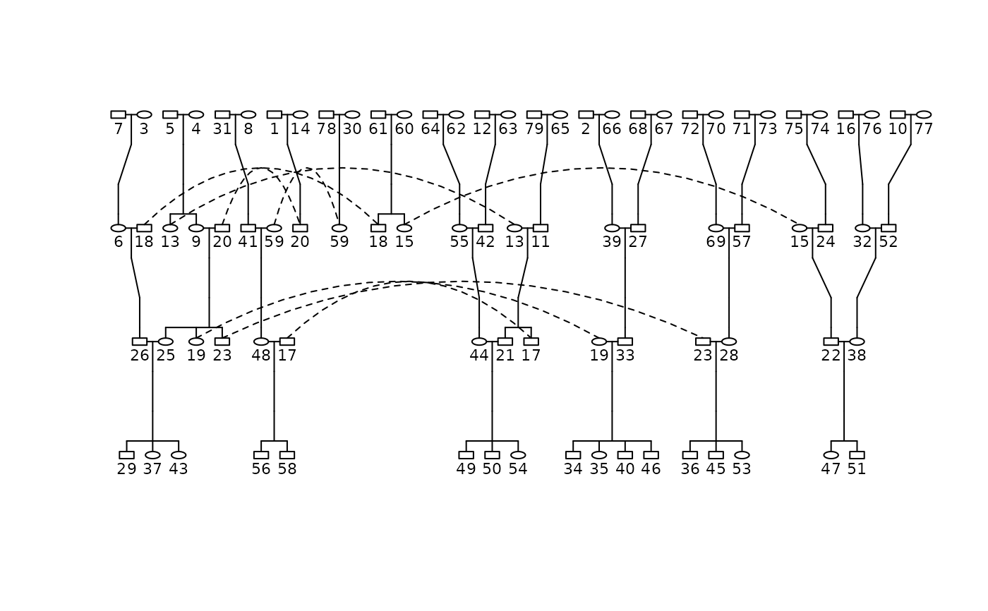 The pedigree in the example below is one where rearranging the founders greatly decreases the number of extra connections. When autohint is called with a a vector of numbers as the second argument, the values for the founder females are used to order the founder families left to right across the plot. The values within a sibship are used as the preliminary order of siblings within a family; this may be changed to move one of them to the edge so as to match up with a spouse. The actual values in the vector are not important, only their order.