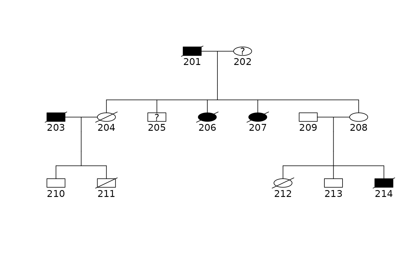ped2 <- pedigree(fam2$id, fam2$father, fam2$mother, fam2$sex,